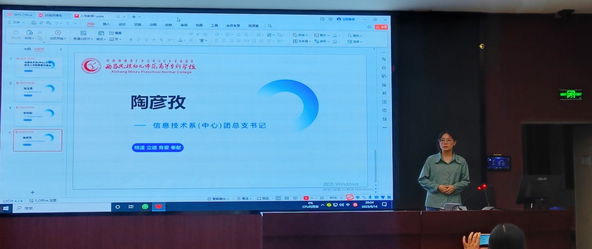 系团总支书书记陶彦孜向新生介绍团总支、学生会机构组成和建设情况,并鼓励大家积极参加学校和系部的社团活动,在活动中锻炼成长,塑造职业素养,丰富大学生活。