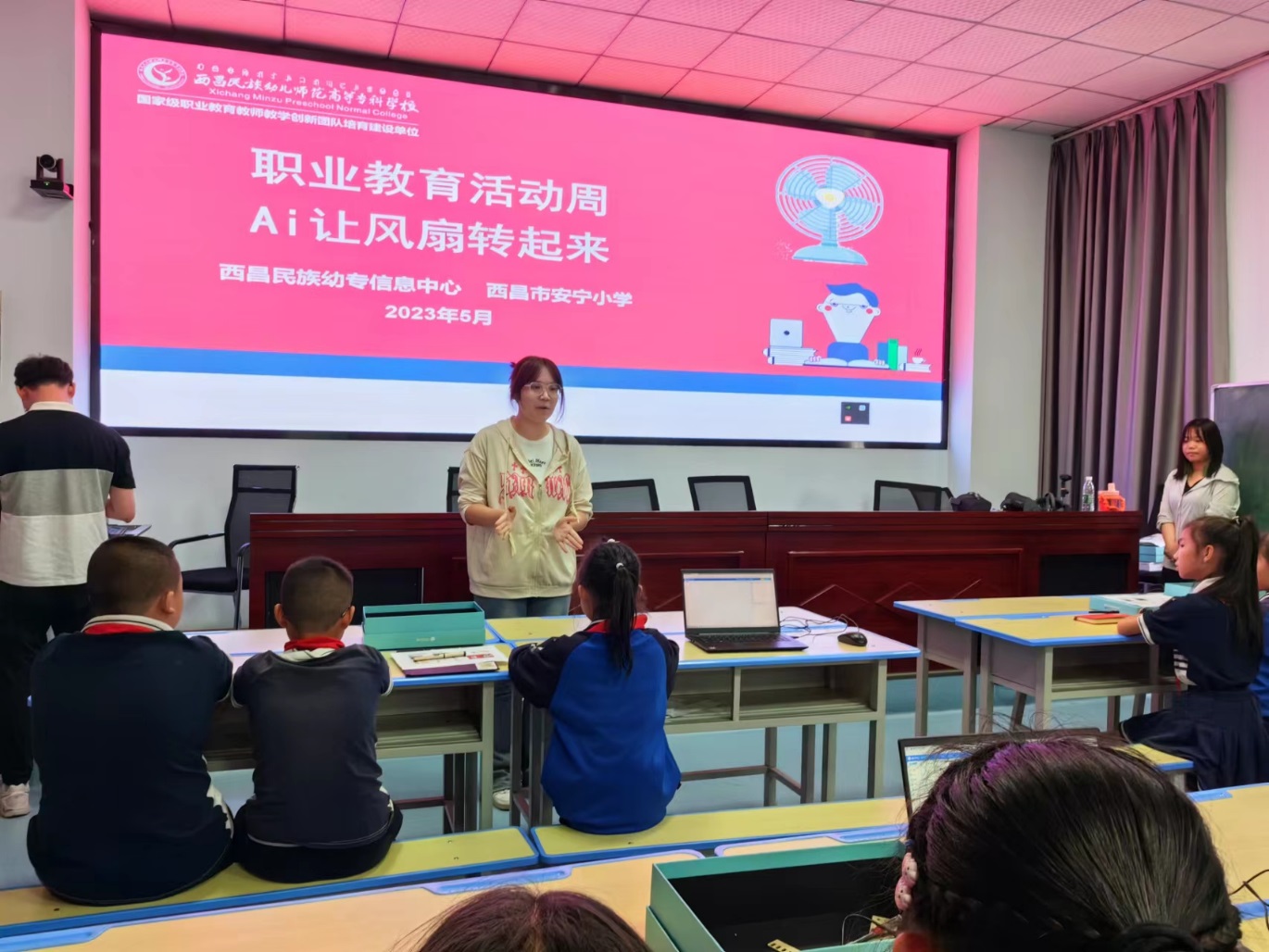 为贯彻落实省教育厅2023年成渝地区双城经济圈职业教育活动周部署,2023年5月18日下午,西昌民族幼专信息技术系计算机应用技术专业一班同学在专业教师熊英、杨洋、杨欣然的带领下,为安宁镇中心小学的一群小学生开展了一堂趣味编程实践课—“AI让风扇转起来”。