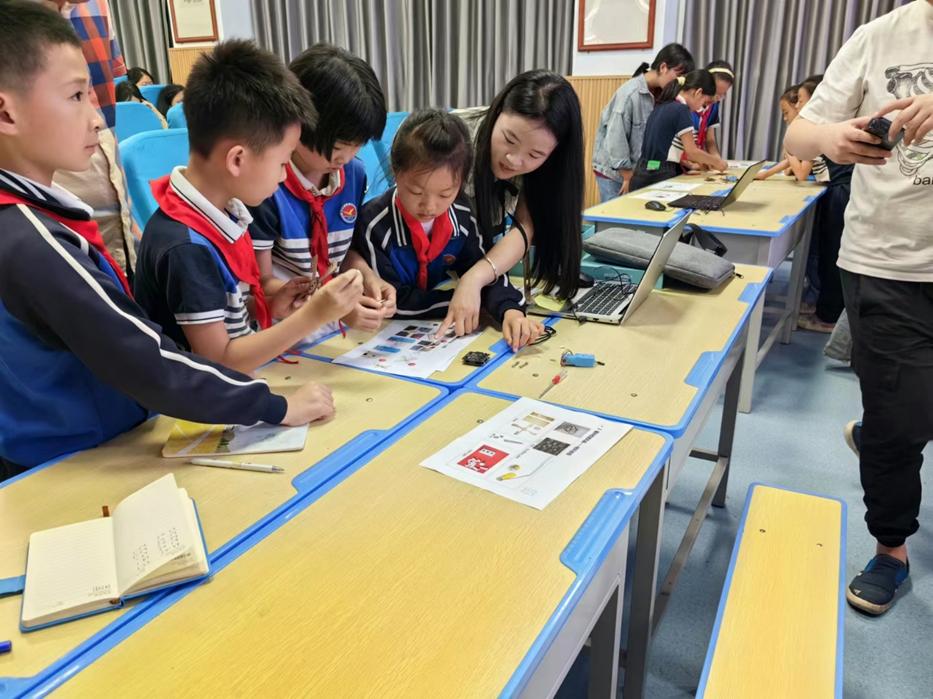 在实践课上信息技术系学生叶美伶,通过启发式教学引导小朋友认识人工智能以及电子编程,并引导他们思考生活中的各种电器的工作原理。随后,学生们分为六个小组,在信息技术系学生的指导下完成了风扇的搭建、芯片和线路的连接。最终,通过电脑的编程,风扇“智慧”地动起来了。