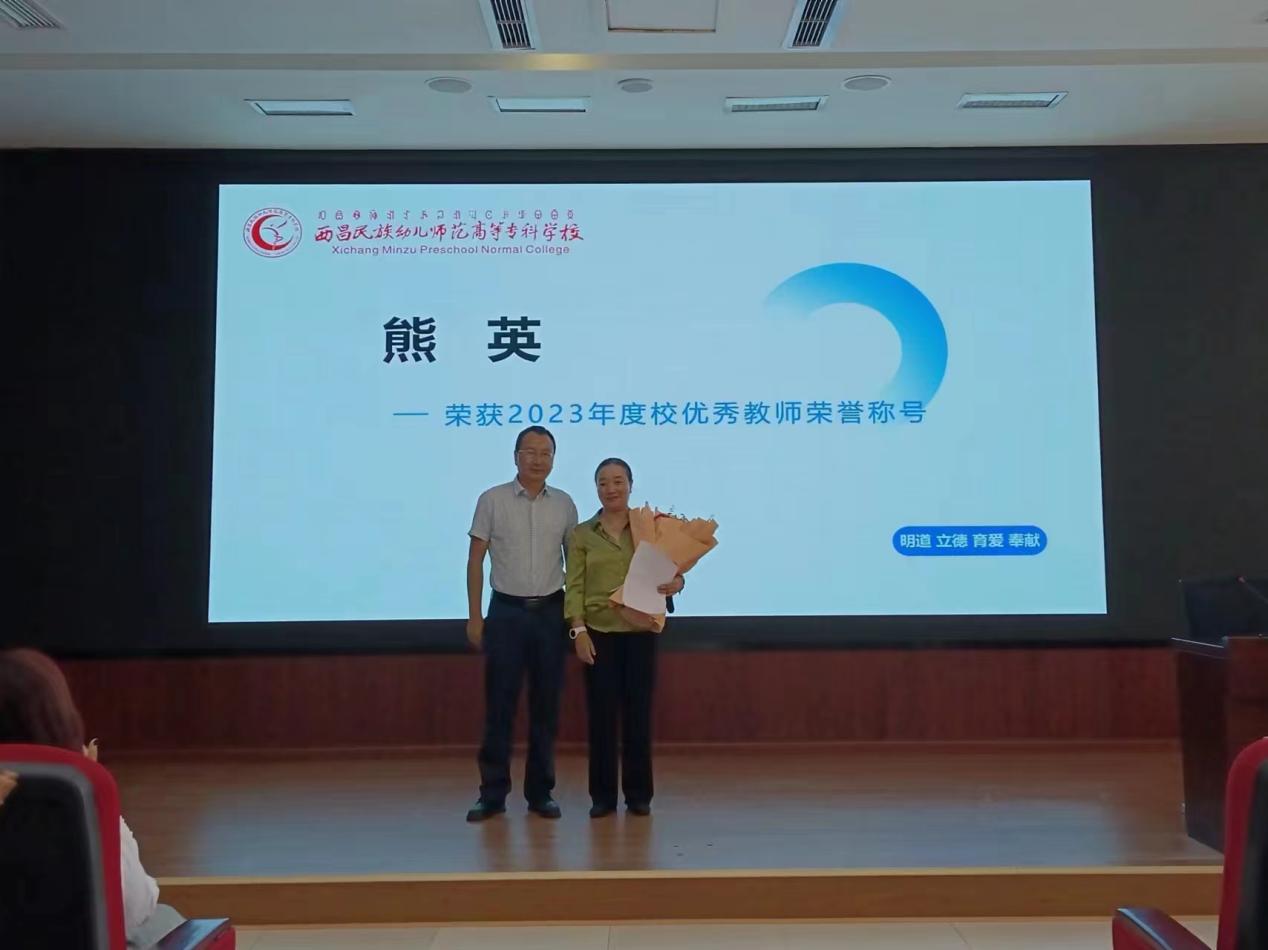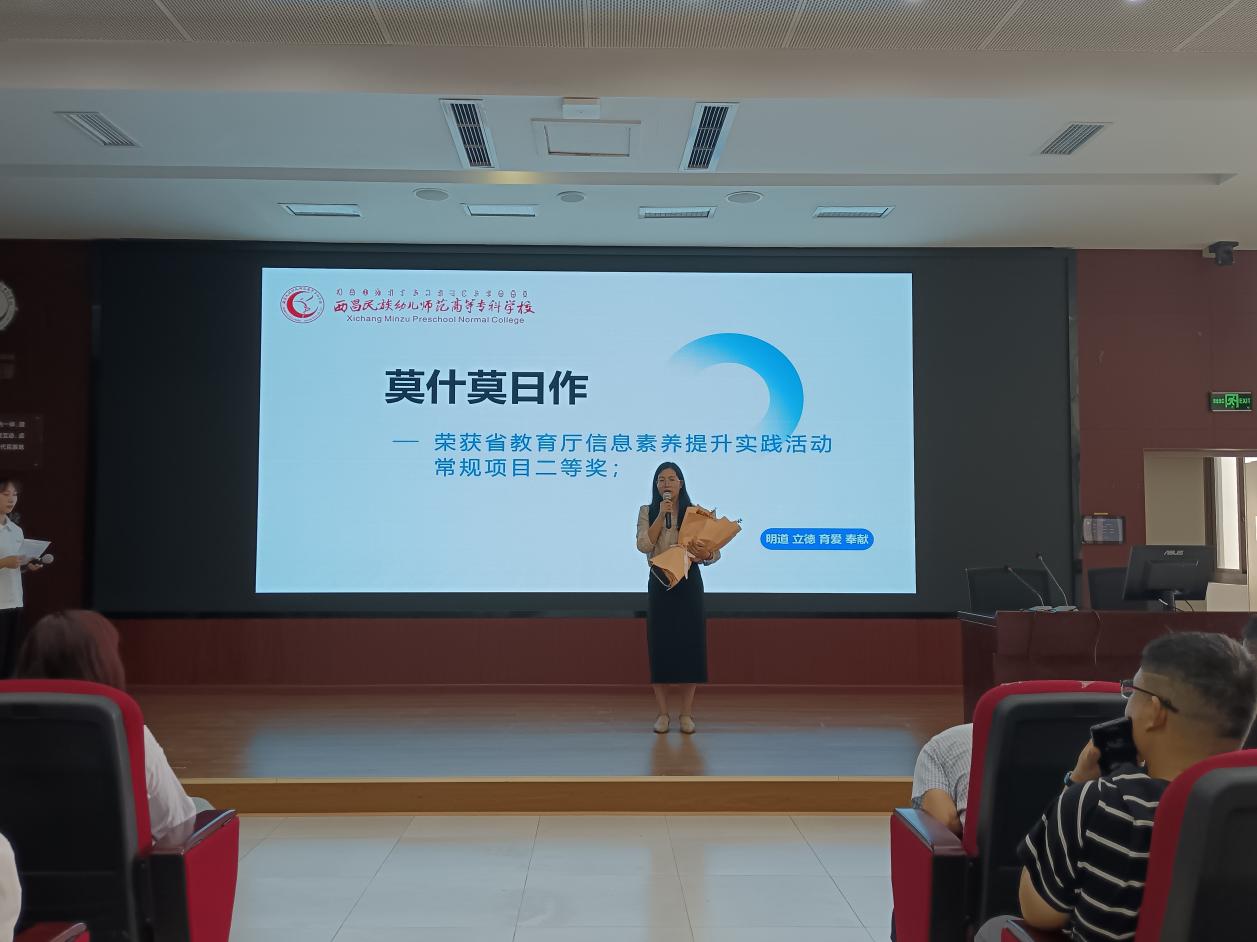 会议首先表彰了在教育教学活动中取得良好成绩的优秀教师:一是荣获省教育厅信息素养提升实践活动常规项目二等奖的莫什莫日老师;二是荣获凉山州“月城杯”网络安全大赛团体三等奖的杨洋老师;三是被评为西昌民族幼专2023年度优秀教师的熊英老师。信息技术系(中心)邹玉泉主任代表系部分别为他们献花,对他们取得的优秀成绩表示祝贺并加以鼓励。台上的老师们纷纷表示,将不忘初心,砥砺前行,继续为信息技术系(中心)美好的明天而努力。