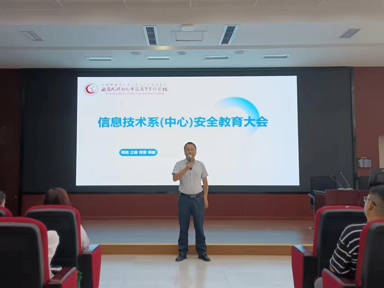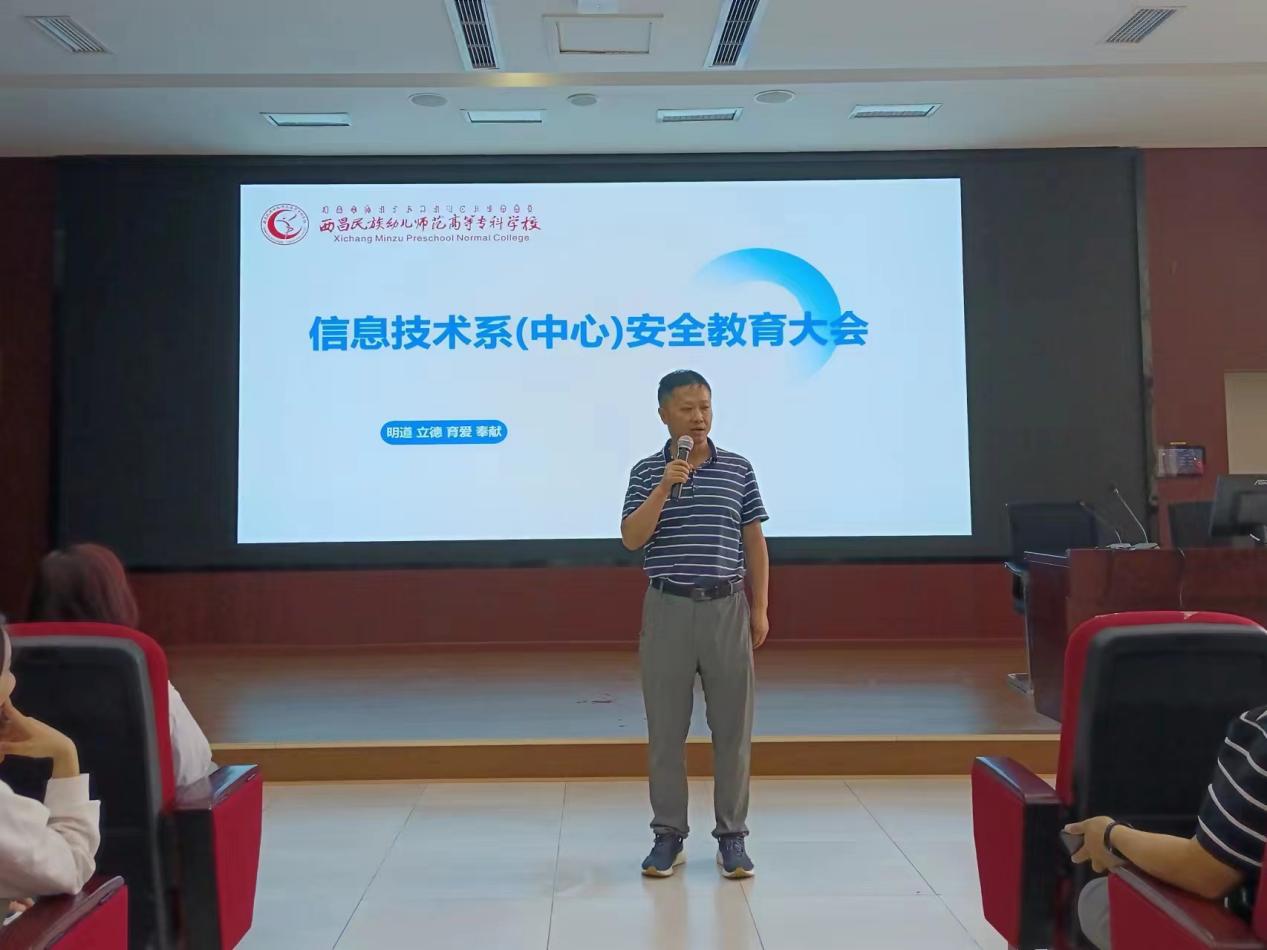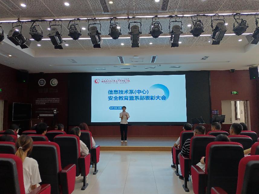 为了进一步提高信息技术系师生的安全意识,加强中心安全教育工作,营造安全文明的校园环境,同时表彰在教育教学岗位上做出贡献、取得成绩的老师以及在 “推广普通话,奋进新征程”活动中取得优异成绩的同学。2020年9月26日,信息技术系在图书馆报告厅举行了安全教育暨系部表彰大会。信息中心主任邹玉泉、副主任李怀阳、系团总支书记陶彦孜、全体教职工及22级23级全体同学参加会议。