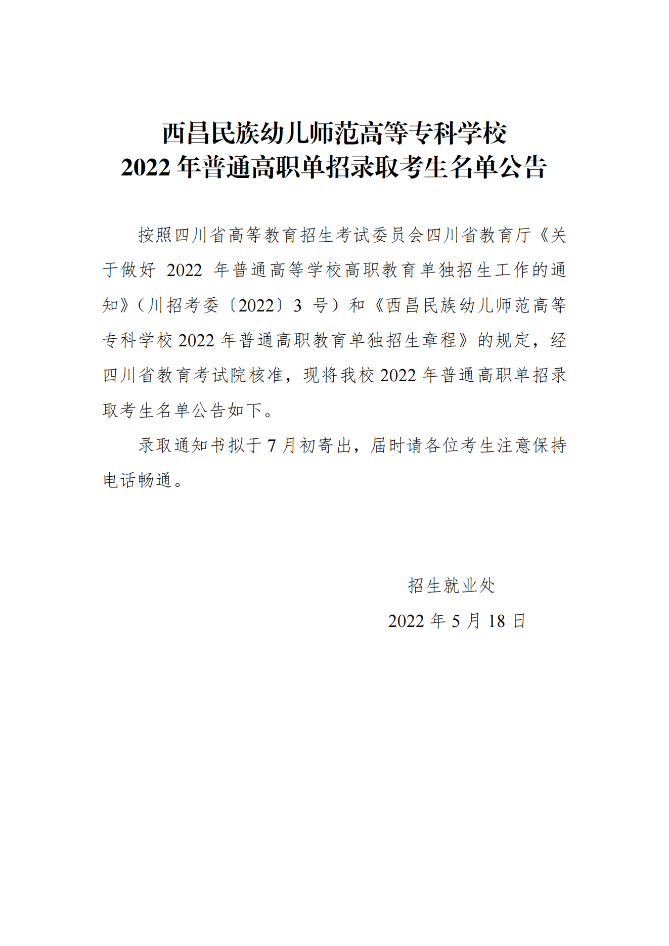 2022年普通高职单招录取考生名单