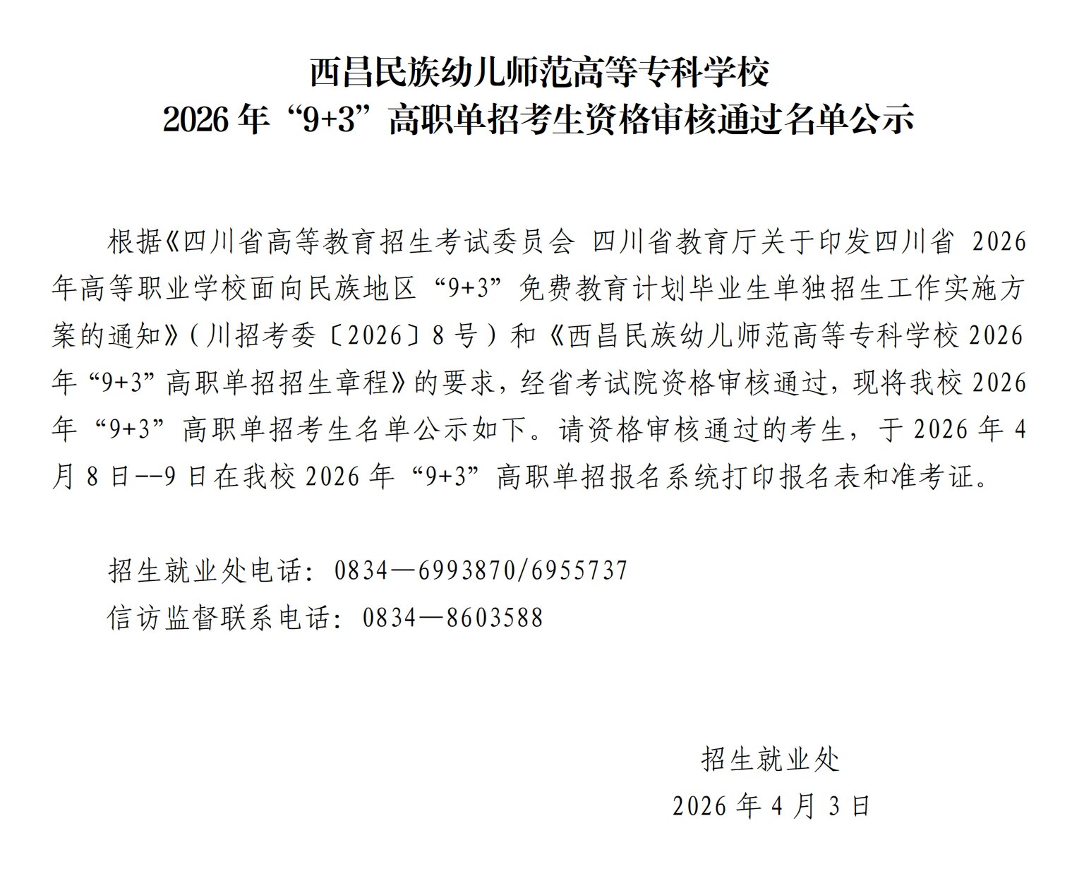 西昌民族幼专 2026年“9+3”高职单招考生资格审核通过名单公示