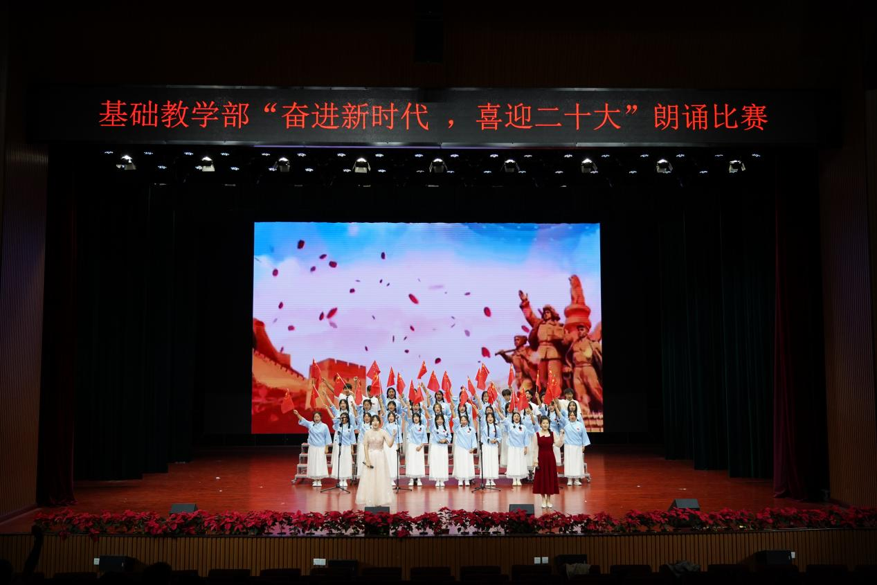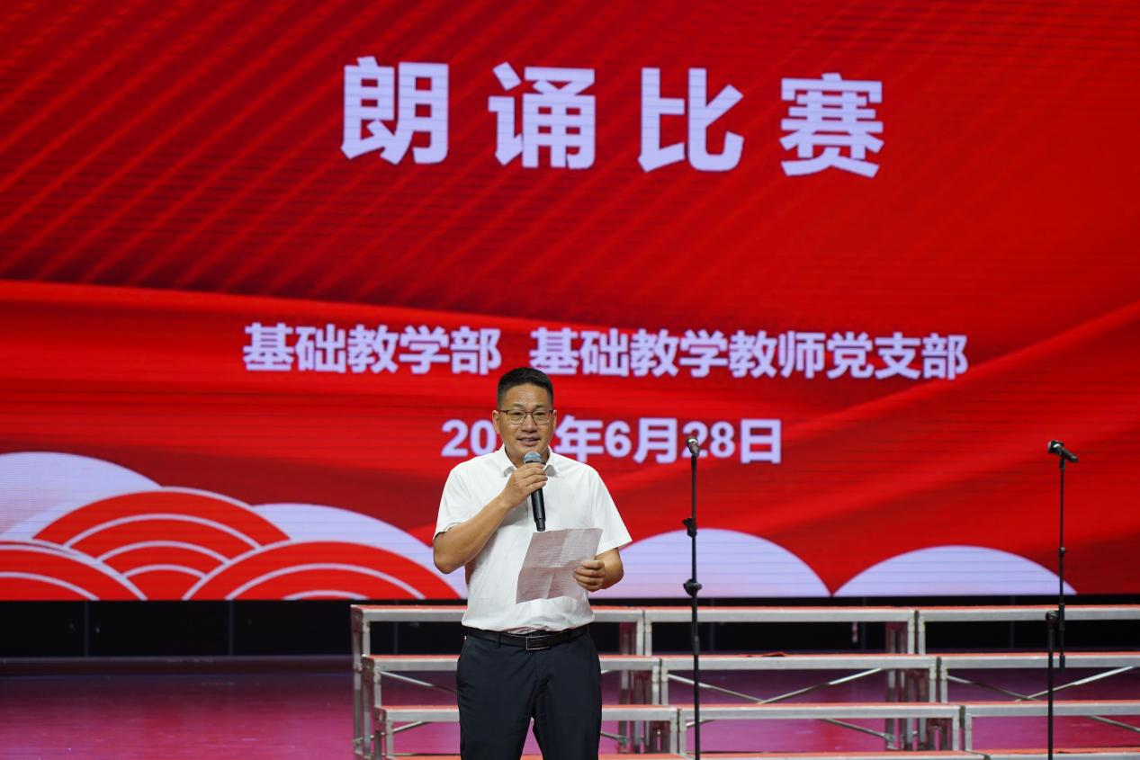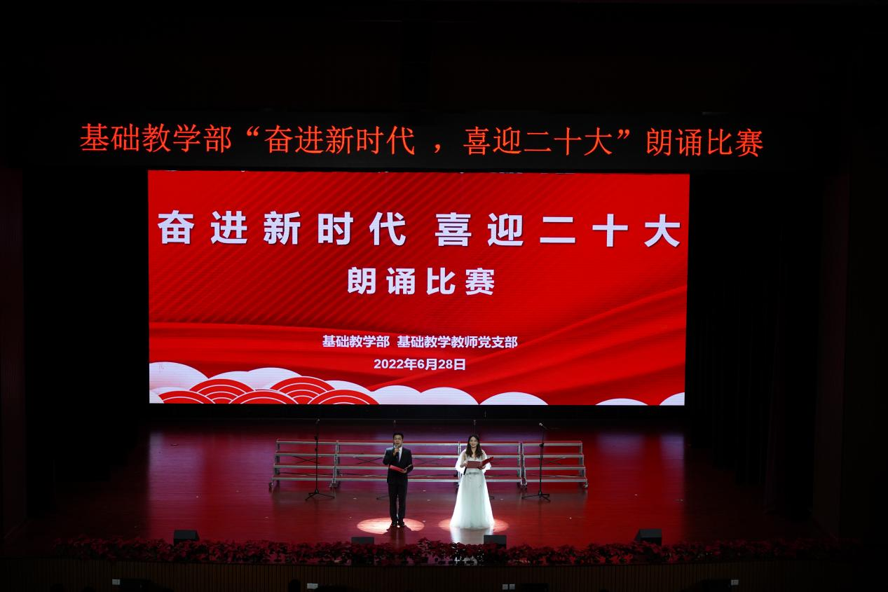 6月28日下午,基础教学部、基础教学部教师党支部以“奋进新时代,喜迎党的二十大”为主题的朗诵比赛在雏鹰剧院举行。学校党委委员、纪委书记沙德康,基础教学部主任高波,联合党总支书记王显华以及基础教学部师生观看此次比赛。