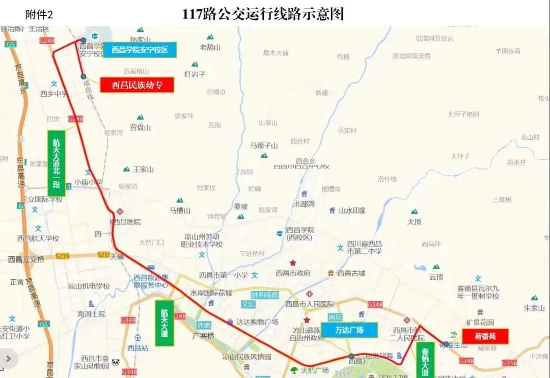 一、起点由西昌民族幼专(西门)至荷香苑,途经学府路、航天大道北一段、航天大道、万达广场、春栖大道、合盐路。