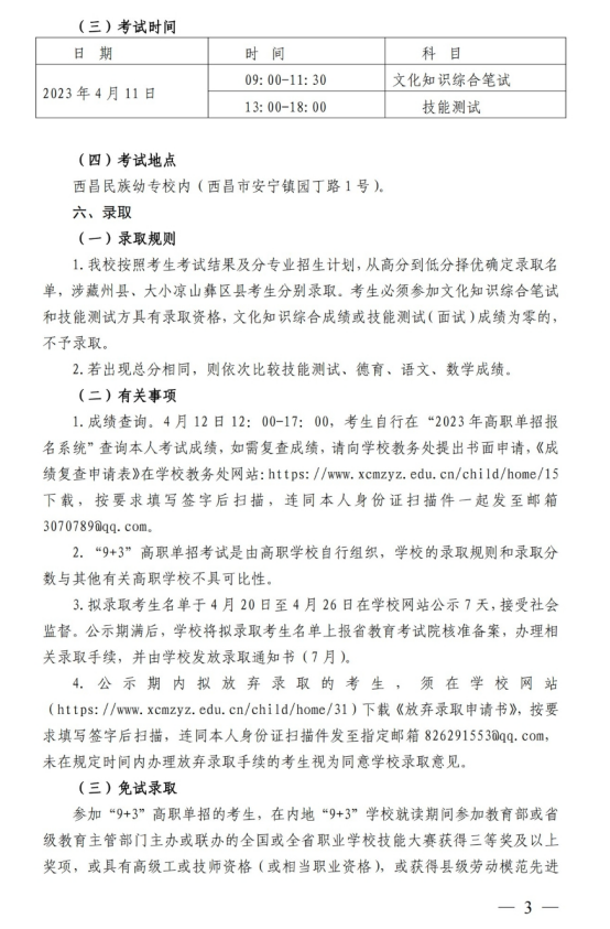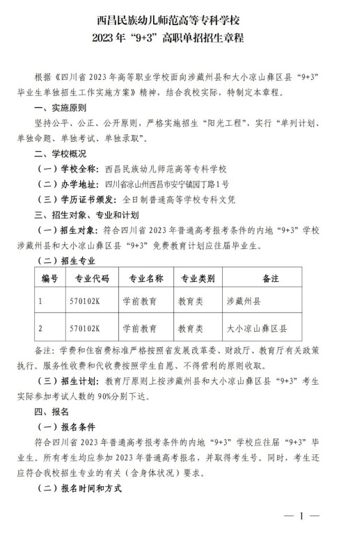 西昌民族幼儿师范高等专科学校2023年(九+三)招生章程