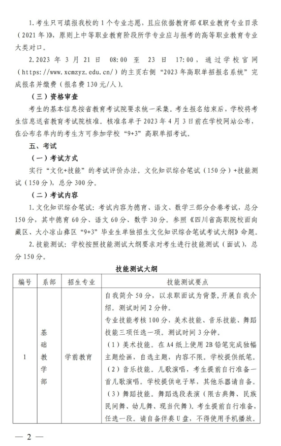 西昌民族幼儿师范高等专科学校2023年普通高考招生章程