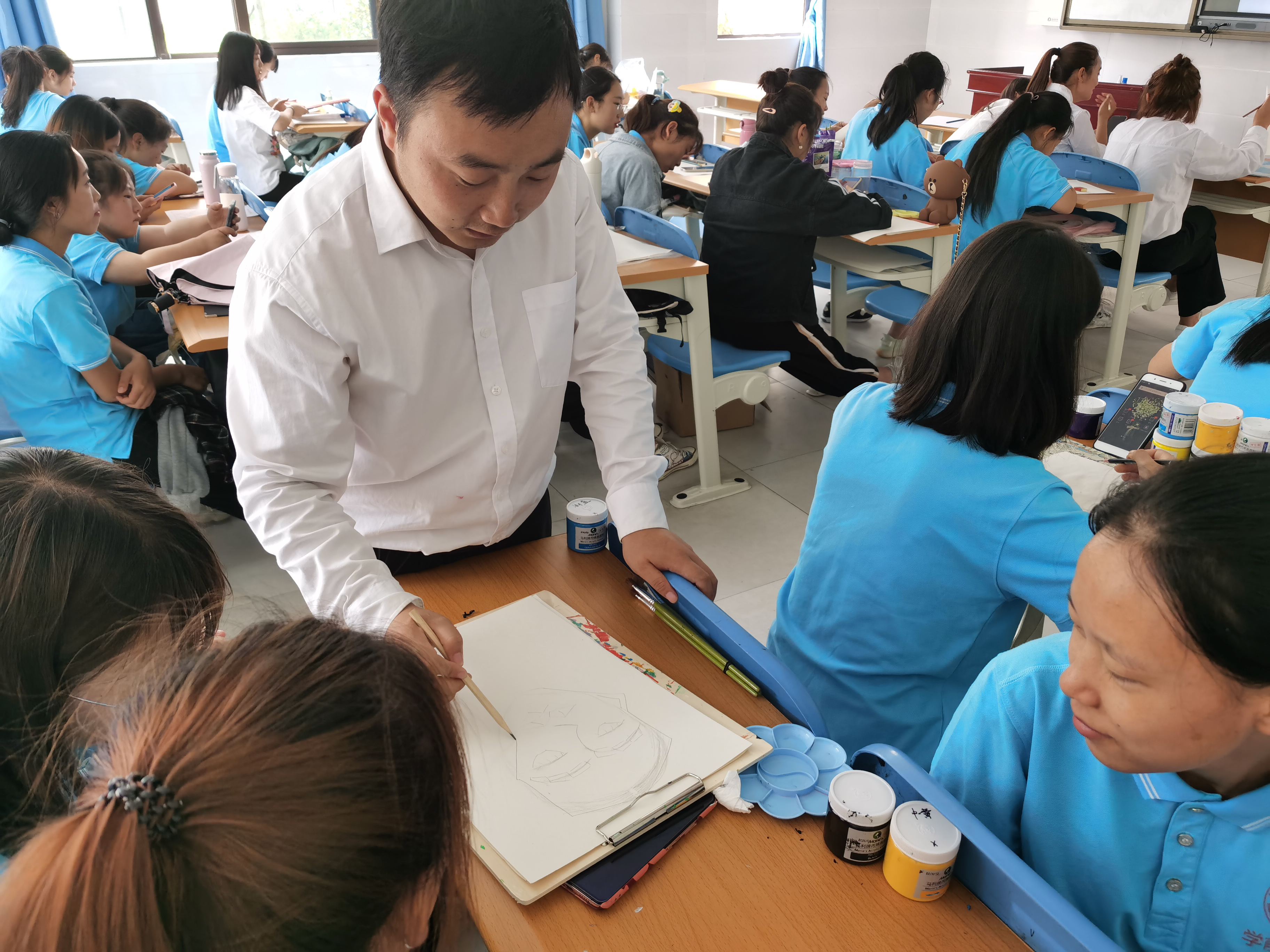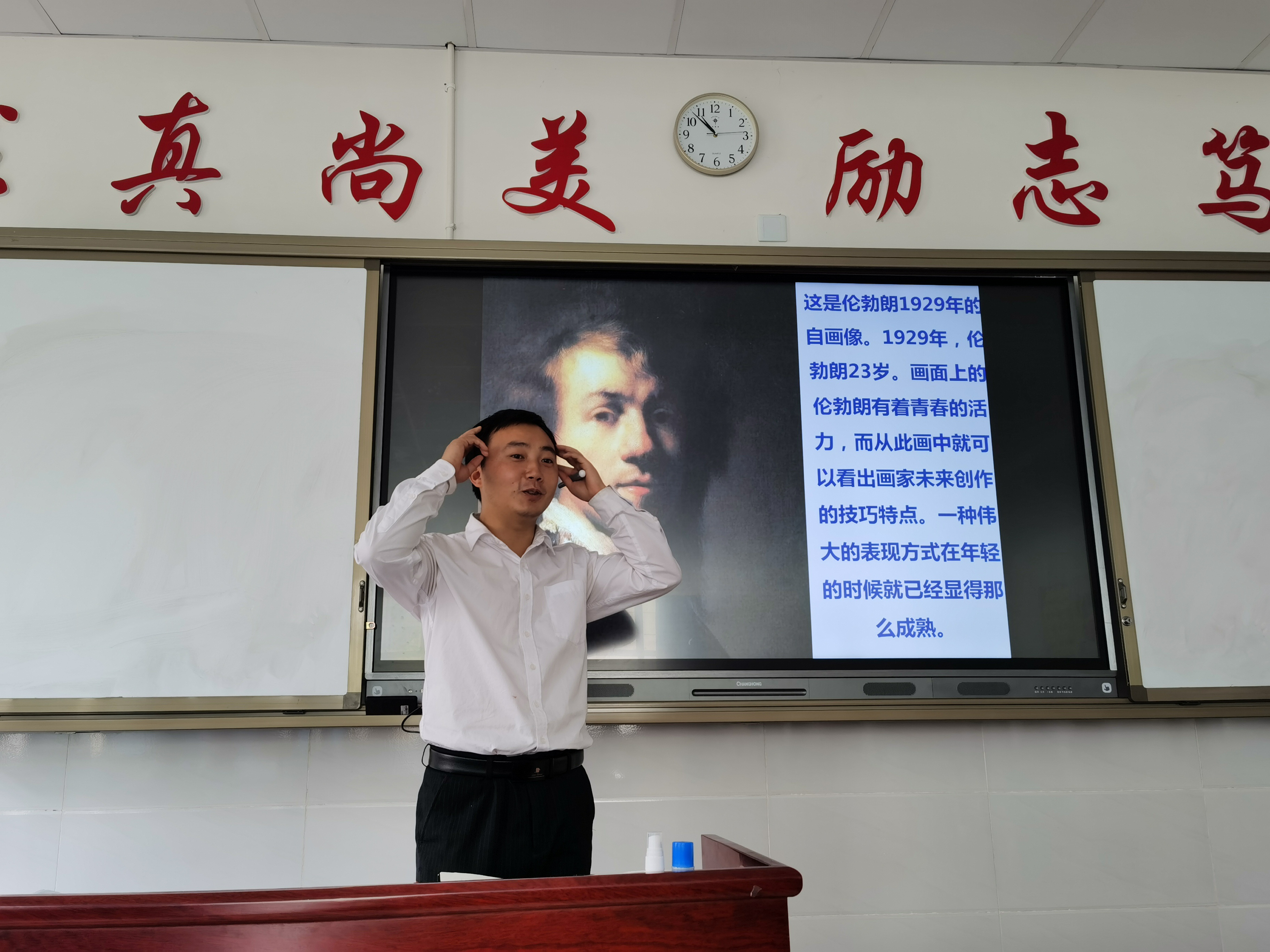 艺术源于生活,生活处处存有艺术。画出美丽,画出心声,美术让我们审美得到提高,心灵得到洗涤。奉双全老师用一只画笔让我们领略大千世界的风光。同学们听的津津有味,对老师的教学课程充满了兴趣。画皮难画骨,从描绘自己开始,感受内心深处的美。本堂课的课程为我的自画像,奉老师用幽默风趣的教学模式带我们感受不一样的自己。