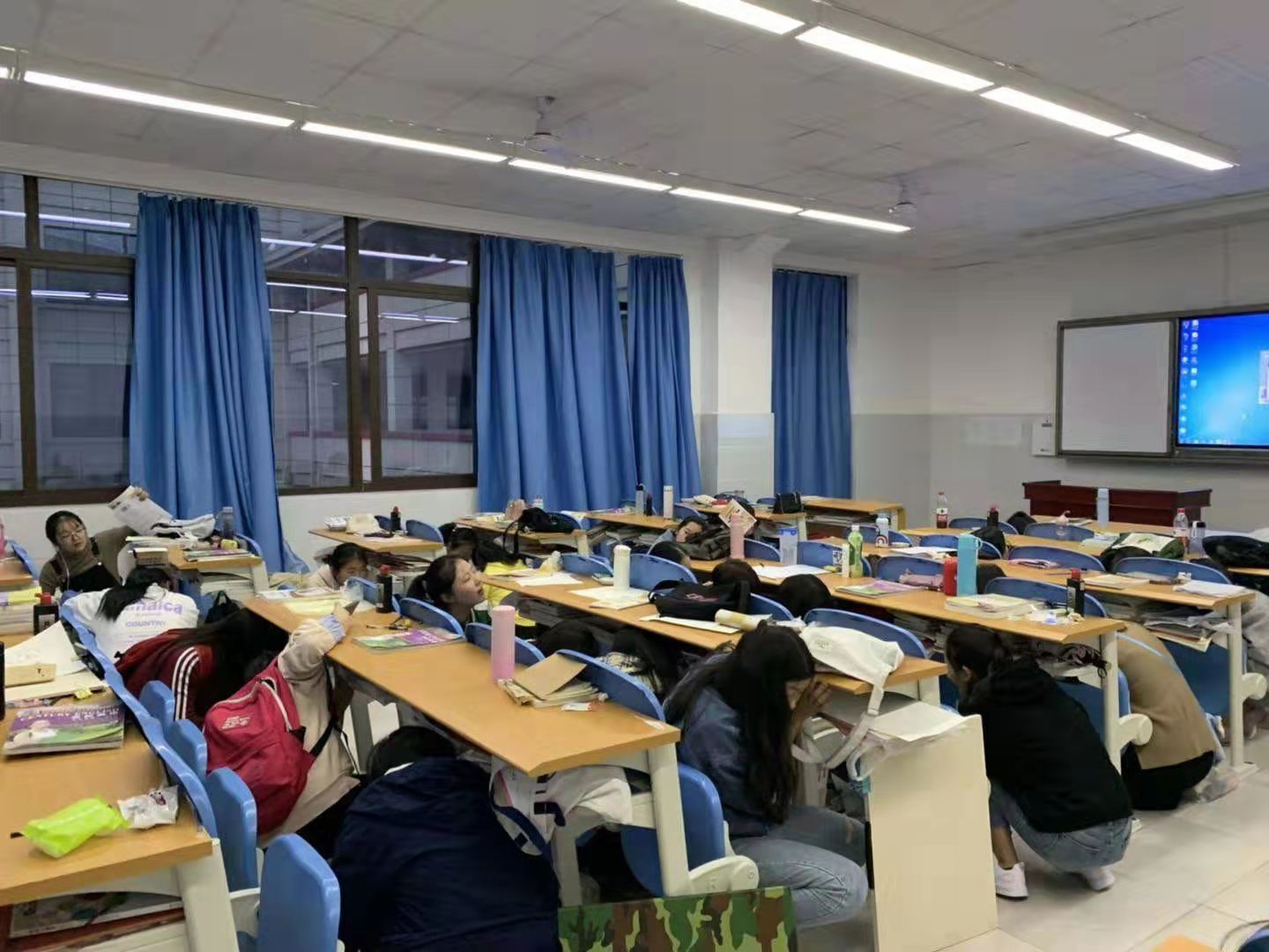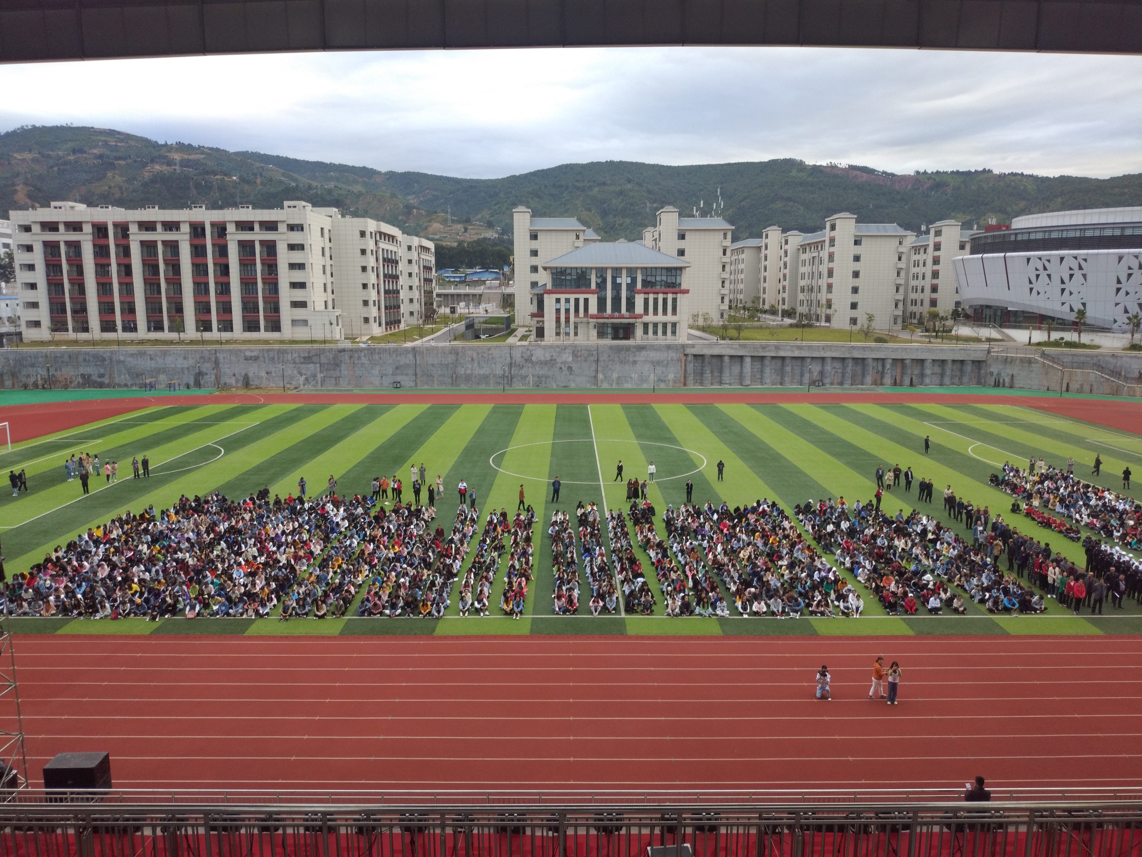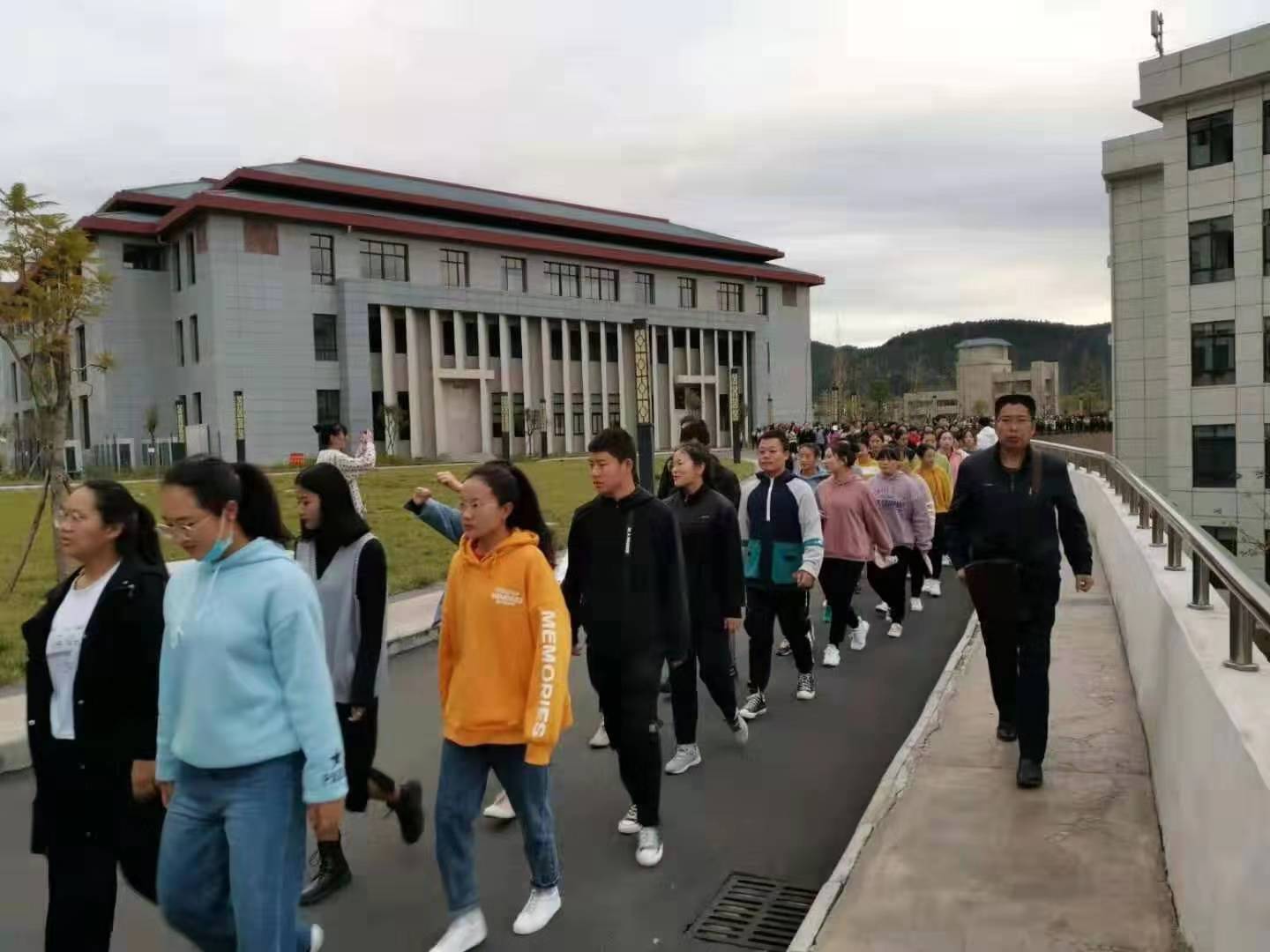 7:50,全系学生在辅导员和老师们的带领下从南大门侧门有序进入学校操场集合,参与全校应急演练总结大会。