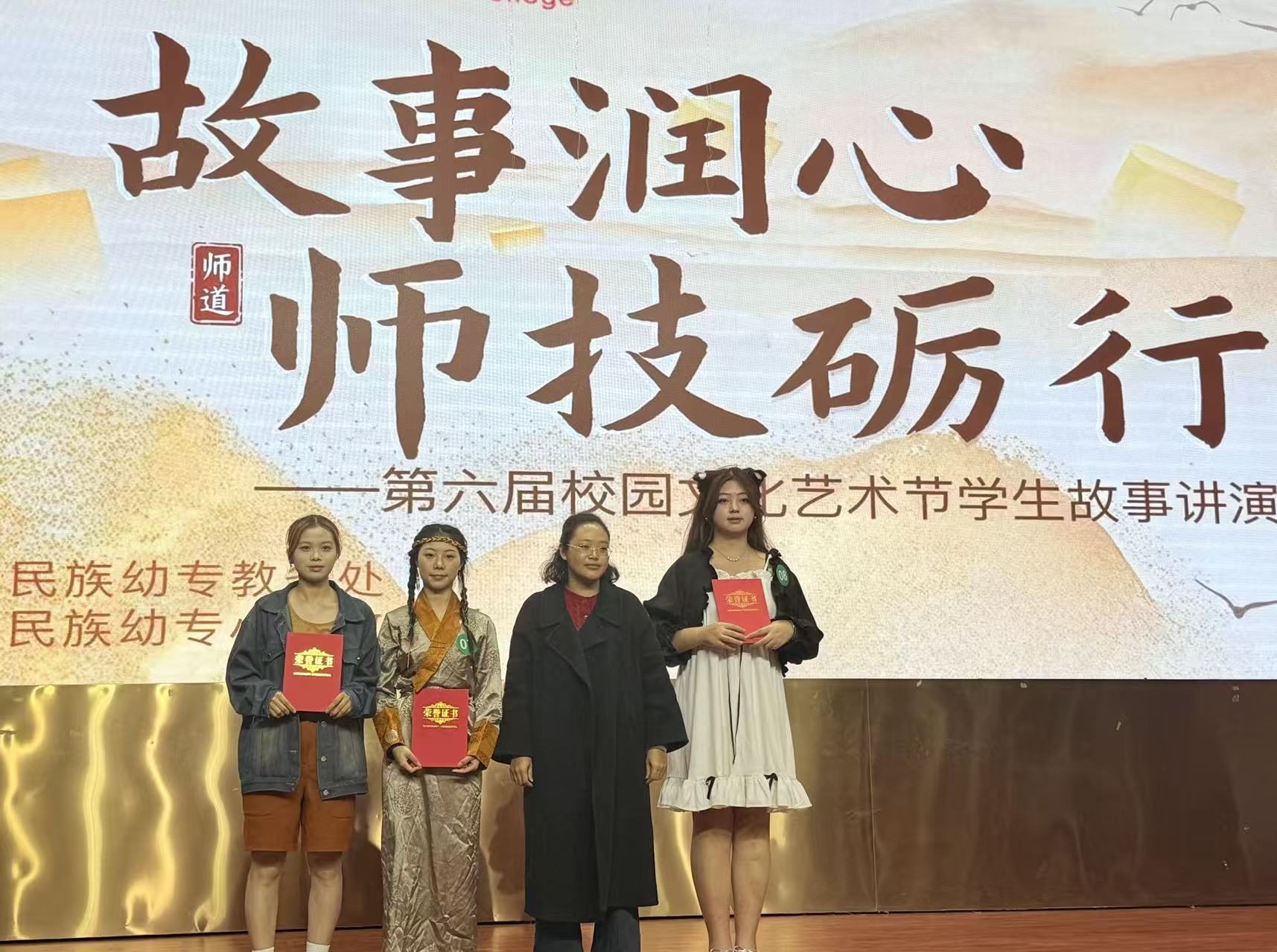 西昌民族幼儿师范高等专科学校于2025年11月13日14:30在学术报告B厅成功举办第六届校园文化艺术节“故事润心,师技砺行”故事讲演大赛。本次大赛不仅是校园文化活动,更是师范生教学技能的综合实践平台,学前教育系的选手们通过角色扮演、道具运用和情境营造,生动演绎了《狮子烫发》《寻找青稞种子》《小英雄雨来》等富有童趣、民族特色与红色教育意义的故事,展现了将故事讲演转化为幼儿教学情境的专业能力。最终,23级杨秀琼荣获二等奖,24级钟鑫鑫和陈学莉均获三等奖,充分体现“以赛促学、以赛促教”的育人成效,彰显了学校在师范人才培养方面的专业理念与实践成果。