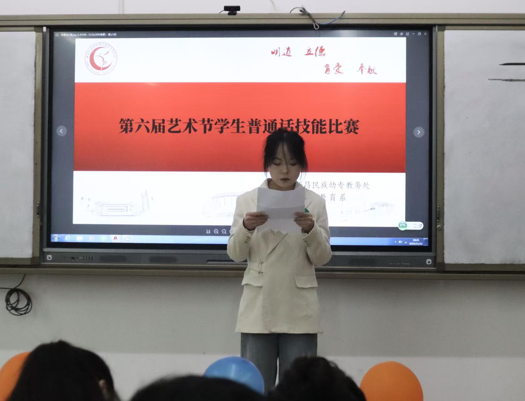 为夯实师范生语言基本功,于2025年11月14日9:00,我校第六届校园文化艺术节“学生普通话技能比赛”正式开始。本次比赛以“以声传情、以语载道”为主题,创新采用“教育场景化表达”形式,展现了学子们的语言素养与对教育情怀的思考。在本次比赛中,我系三名同学表现优异:焦冬茹(25级学前1班)获第二名,蔡欣航(25级学前6班)获第六名,王婷(25级学前六班)获得第八名。学前教育系将持续搭建情怀+情怀”的成长平台,助力学子在未来课堂中播下爱与成长的种子。