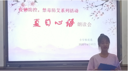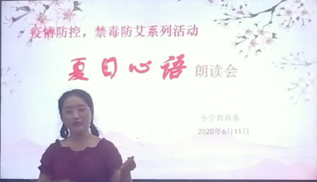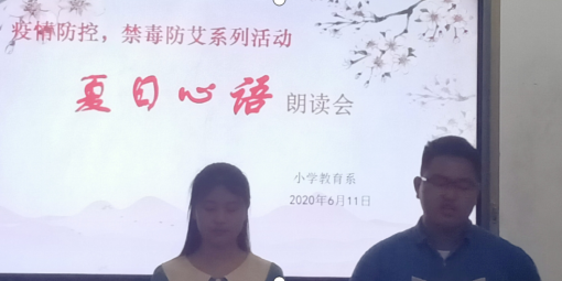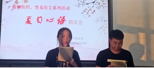 小扇引微凉,悠悠夏日长。2020年的春节,本是阖家欢乐,喜气洋洋的日子,但我国却爆发了新冠病毒。不过,通过我们全国人民的共同努力,我们最终打赢了这场疫情防控阻击战,今日,我系举行了“疫情防控,禁毒防艾”的夏日心语朗读会。