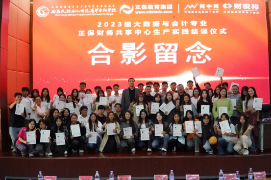 仪式接近尾声,全体参会领导、教师与同学们共同上台合影留念,镜头定格下这一充满意义的时刻。此次订单班结课仪式的圆满举行,不仅标志着西昌民族幼专2023级网中网订单班正保财务共享生产实践课程的顺利收官,更彰显了校企协同育人的深厚成效。未来,西昌民族幼专与正保集团将继续深化产教融合,探索更多“实战化、精准化”的人才培养模式,为财会行业输送更多高素质技能型人才,助力职业教育高质量发展!