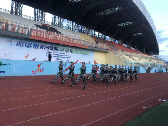 在全体师生的注目下,英姿飒爽的国旗队队员迈着铿锵的步伐护送着鲜艳的五星红旗向国旗台走去。