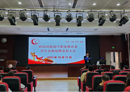 2023年10月31日下午,职业教育系换届表彰大会在学校图书馆学术报告厅顺利召开。职业教育系党总支副书记李刚、系副主任秦毓志以及全系专、兼职辅导员老师们莅临现场指导。本次换届表彰大会的成功召开,不仅加强了学生会工作经验的交流而且让我们明确了每个人的职责,激励着每个人奋发向上,用最好的状态去迎接工作中的挑战。相信在全体学生会成员的共同努力下,学生会的工作将会做的越来越出色。
