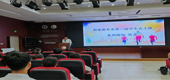 职业教育系第三届学生会主席团代表扎西郎加对上学年学生会的工作作总结报告。鼓励新一届的同学团结奋进,明确分工,并为之努力奋斗,争取为学生会贡献属于自己的力量。在新的一年里,学生会的工作要进一步发展,为同学们提供更多更好的服务。