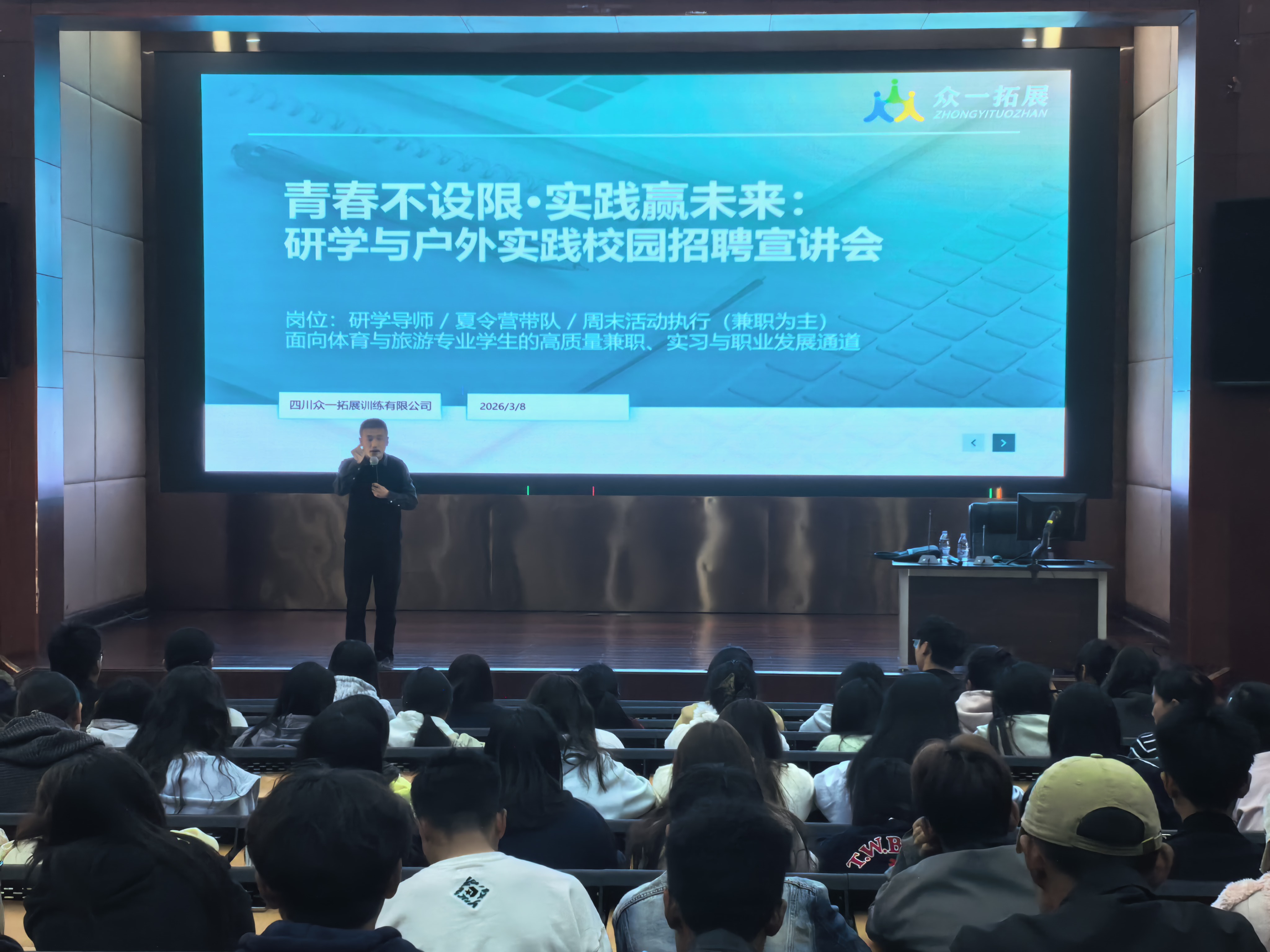 为进一步实施2024级学生实习就业规划工作,搭建精准对接平台。由职业教育系党总支、基础教学部党总支主办的“研学与户外实践校园招聘宣讲会”,在我校学术报告A厅成功举办。活动由职业教育系党总支副书记、副主任秦毓志主持,我校旅游管理、体育教育专业100余人参加了活动。此次活动旨在深入贯彻产教融合、校企协同育人理念,为即将踏入社会的学子铺就通往职场的“快速路”。