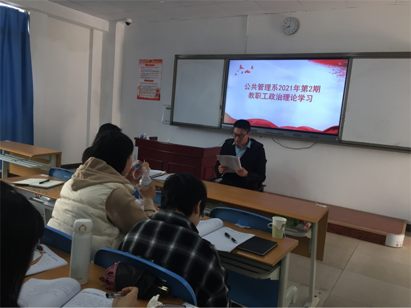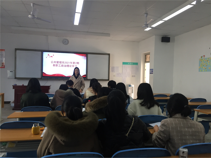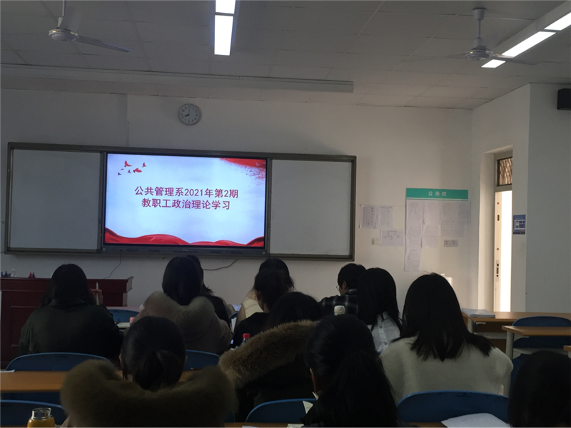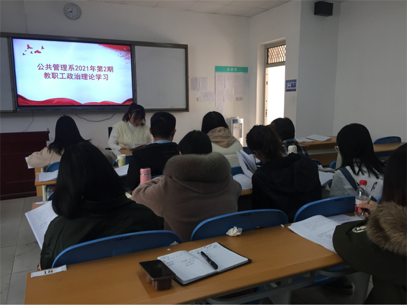 为加强全系教职工的政治理论学习,提高教职工学习的针对性和实效性,增强推动学校改革发展的思想自觉和行动自觉,根据学校党委工作部署,结合时事政治和工作实际,我系于2021年3月2日下午14:30-17:00在第3教学楼3202教室召开全系教职工政治理论学习会议。会议由公共管理系主任曾艳主持。