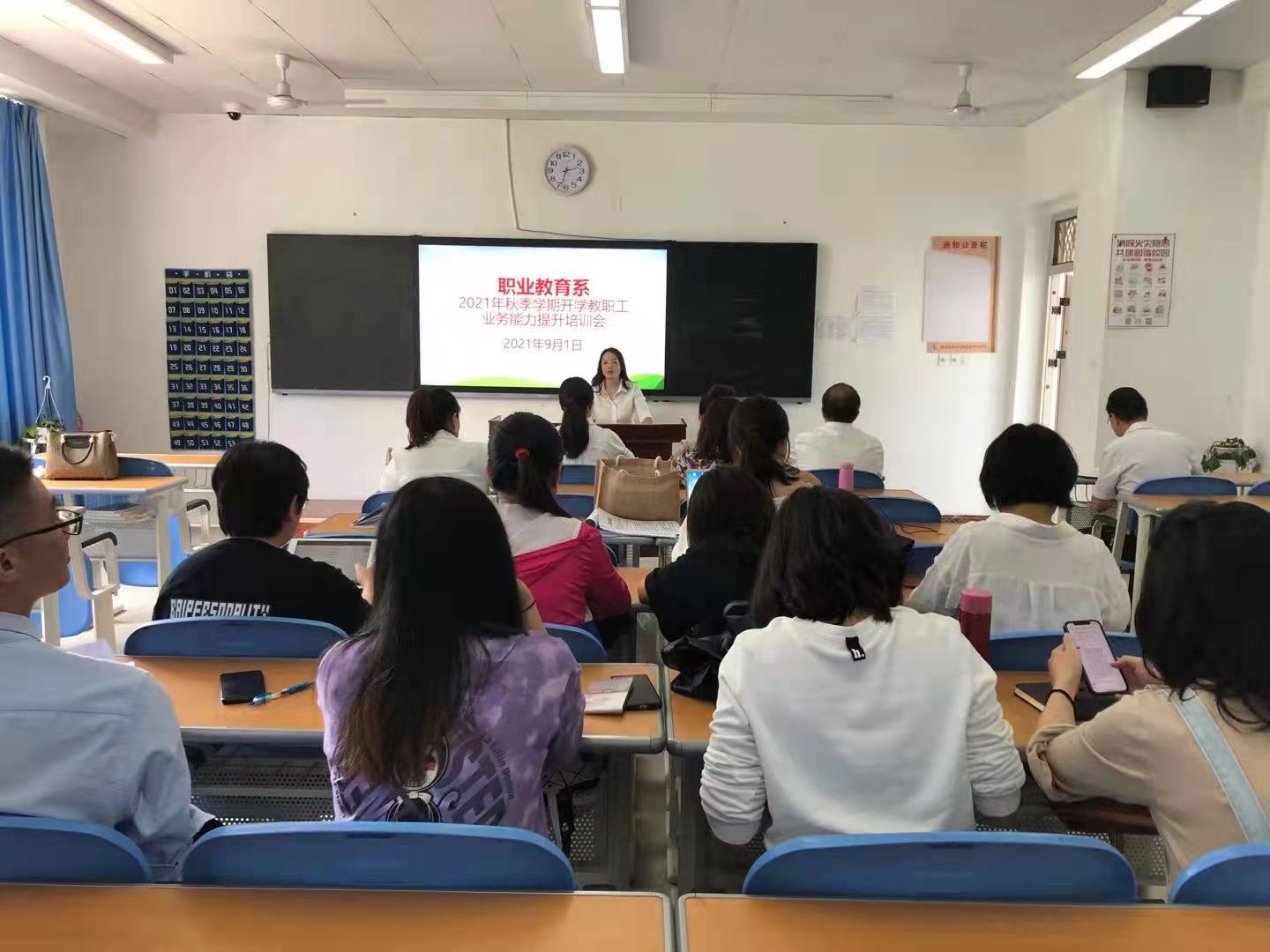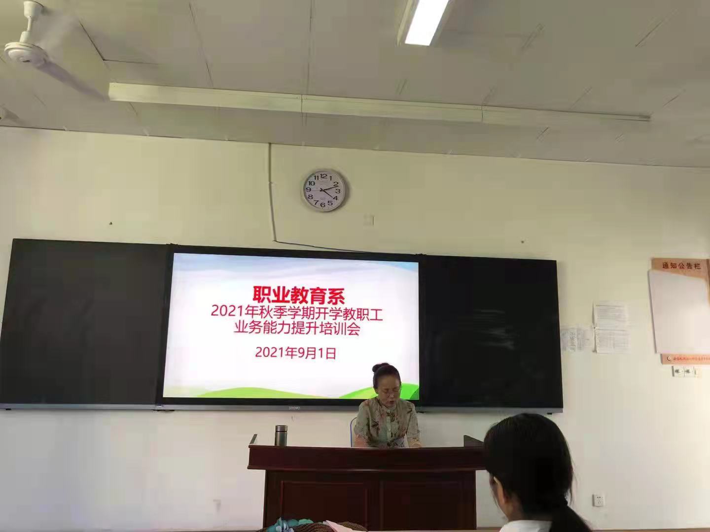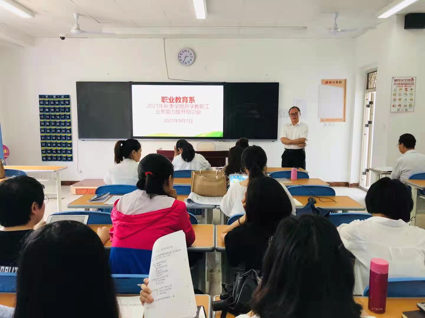2021年秋季学期开学之际,为进一步加强师德师风建设,规范教育教学工作,树立现代高等教育理念,提升全体教职对学校办学理念和文化的认同,增强爱校、爱岗、敬业的责任感、使命感,进一步推动系部规范入流、内涵发展,结合系部实际。职业教育系开展了教职工业务能力提升培训会议。