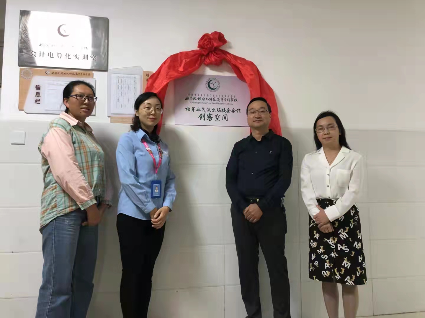 校园宣讲后之后,职业教育系教师与沃尔玛西昌分店经理一行人前往第一教学楼参观沃尔玛校企合作创客空间并举行了揭幕仪式。创客空间以“柚芽业茂”为名,寓意幼专学子能够在校企合作下发芽成长、事业繁茂,这不仅是对幼专学生的深切期望,也是幼专全体领导、老师的共同育人目标。