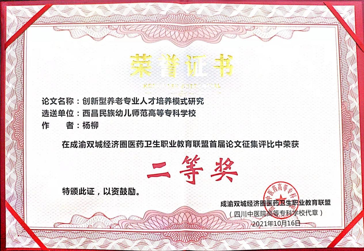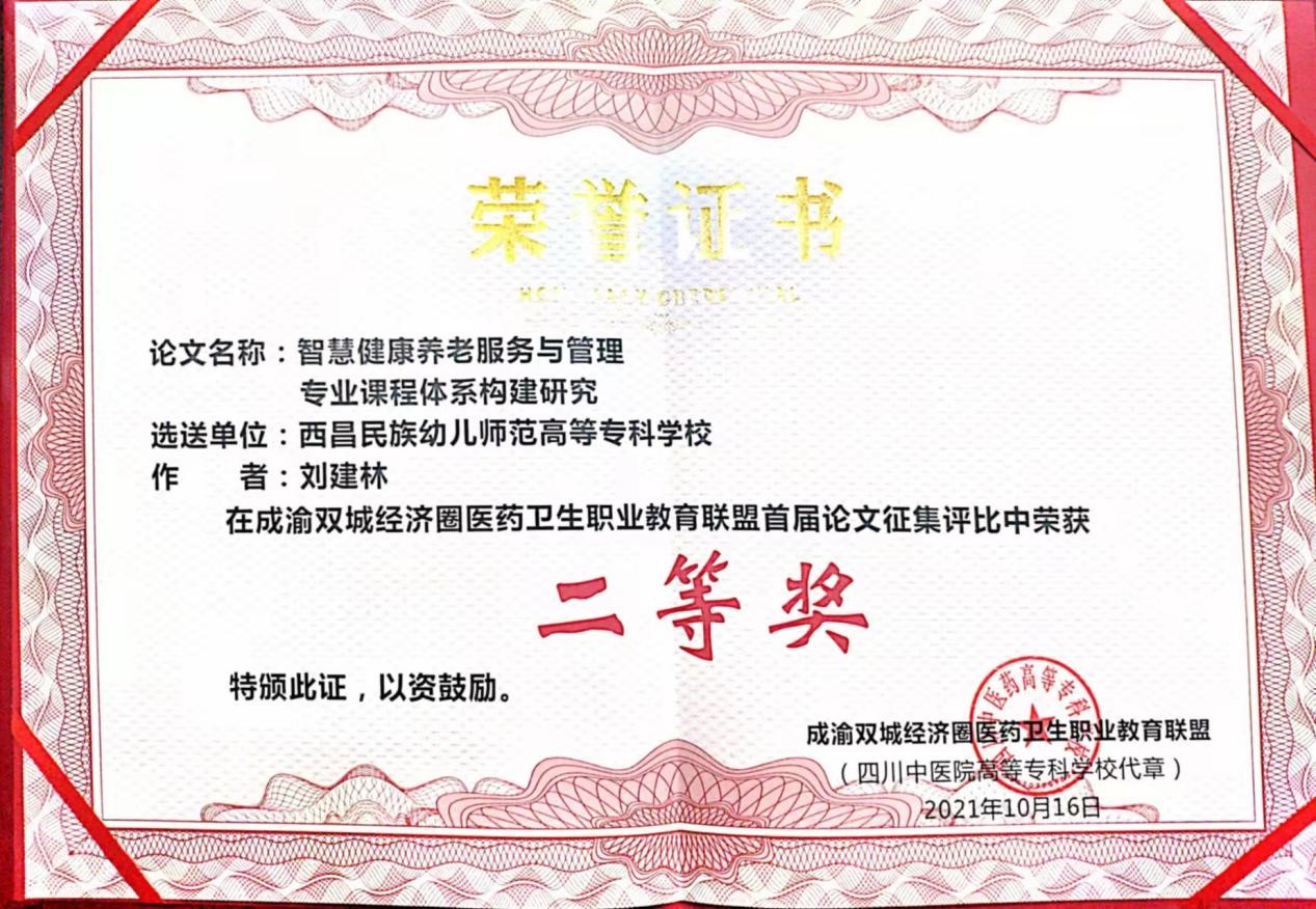 在成渝双城经济圈医药卫生职业教育联盟第一届论文征集大赛中,刘建林、杨柳老师选送的论文《智慧健康养老服务与管理专业课程体系构建研究》《创新型养老专业人才培养模式研究》分别获得二等奖。