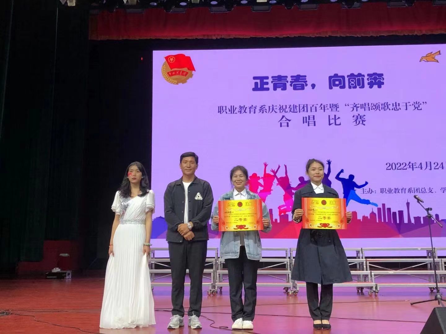 为庆祝“中国共青团成立一百周年”,西昌民族幼专职业教育系团总支和学生会组织了庆祝建团百年暨“齐唱颂歌忠于党”合唱比赛晚会,晚会在系部各个领导的关心支持下,在各班老师们的积极参与下,同学们以高昂的斗志,饱满的热情,将那一段段热血的历史讴歌在雏鹰剧场。经过比赛的紧张,晚会活动圆满结束。