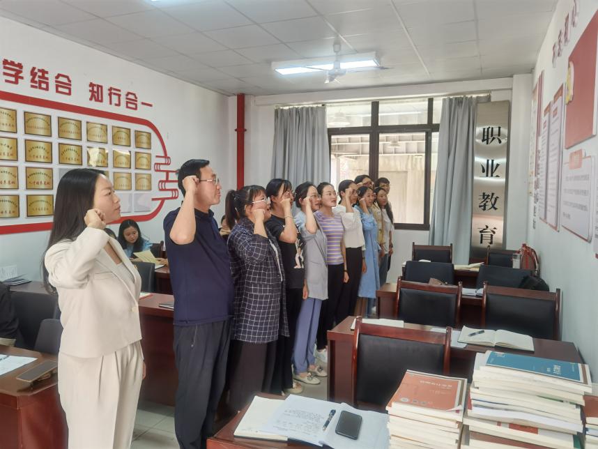 会上,党支部书记李刚组织全体党员重温入党誓词,学习学校关于印发迎评促建五月工作要点的通知、《人才培养工作文档材料基本要求》等文件精神,组织学习了《职业教育系“强教风、严学风、优校风”整治工作方案》、《职业教育系绩效工资考核实施方案》,并广泛征求教职工意见建议;对职业教育系党风廉政建设工作进行了安排部署,对参会干部职工开展了党风廉政知识教育和廉洁从教教育,并对招生就业、物资采购、实验实训室项目推进、学生奖学金、助学金发放、评选先进优秀集体和个人等廉政风险点进行排查。党支部支委、各教研室主任、办公室干事、教学干事、学工干事、工会组长依次总结4月党建工作开展情况以及5月工作计划。