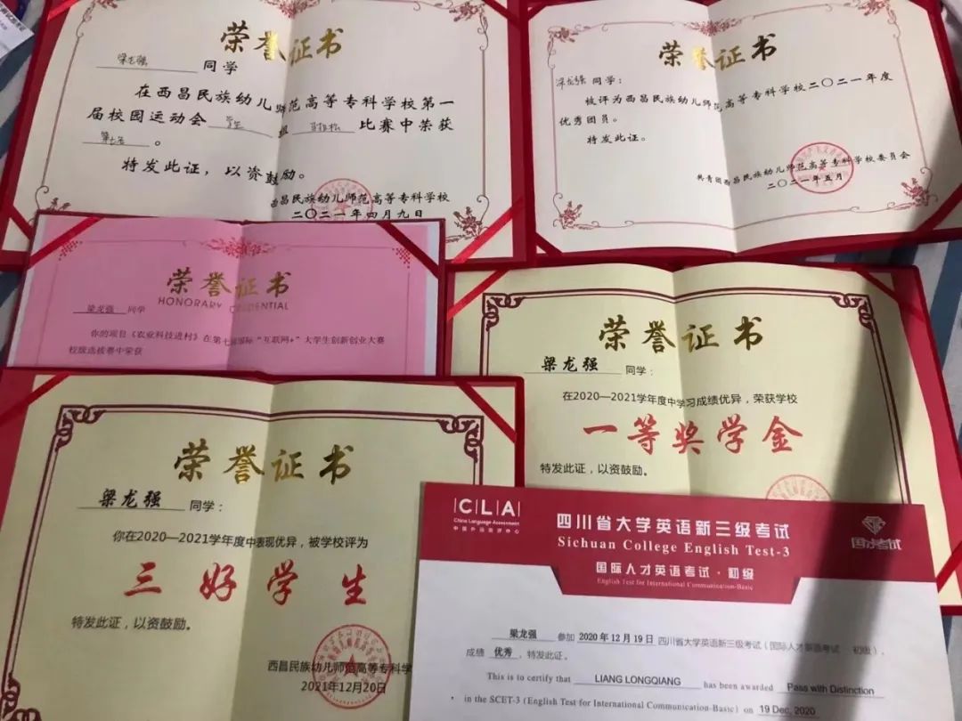 好高的羁鸟最喜飓风的味道,飞扬的少年最知远山的明亮。青春的朝暮总会因为少部分人的努力尽显辉煌,本期栏目为大家分享西昌民族幼专20级旅游管理1班梁龙强同学的故事。梁龙强同学在英语四级考试中取得534分的好成绩,在创新创业比赛中获得银奖,在四川省导游风采比赛中荣获二等奖……