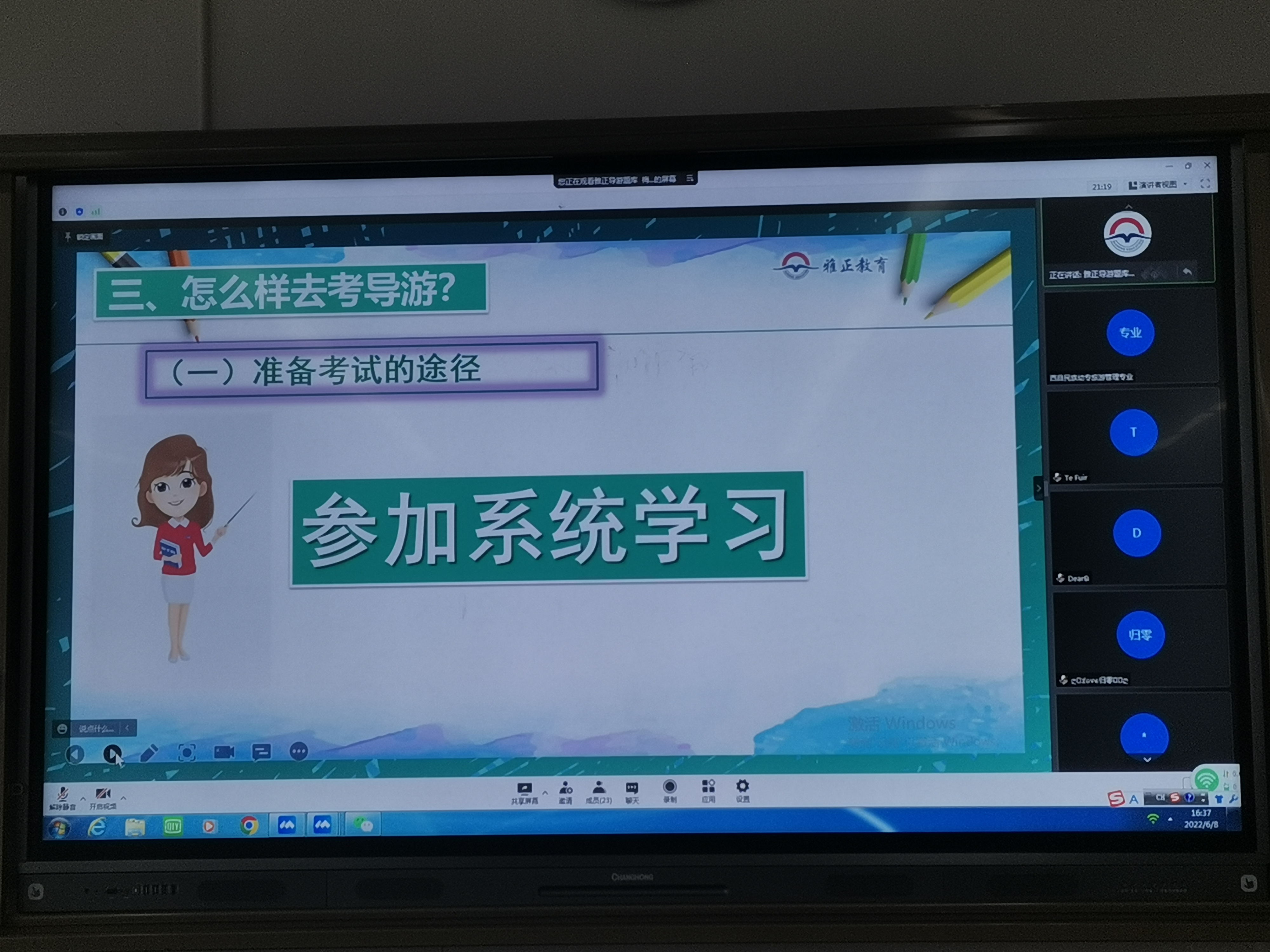 导游证是旅游管理专业最重要的专业证书,为了让同学们更好的了解导游证及导游证考试相关事宜,提高导游资格证考试通过率,2022年6月8日下午4点30,我校旅游管理专业在1614教室举行了导游证分享会。本次分享会由雅正教育蒋老师主讲,21级旅游管理专业全体学生以及旅游管理专任教师熊莲参加。由于疫情原因,本次分享会为线上分享。