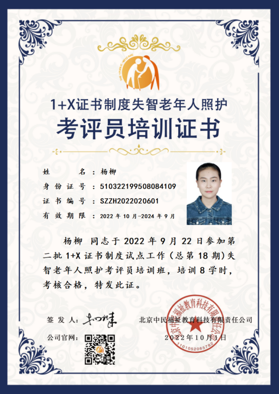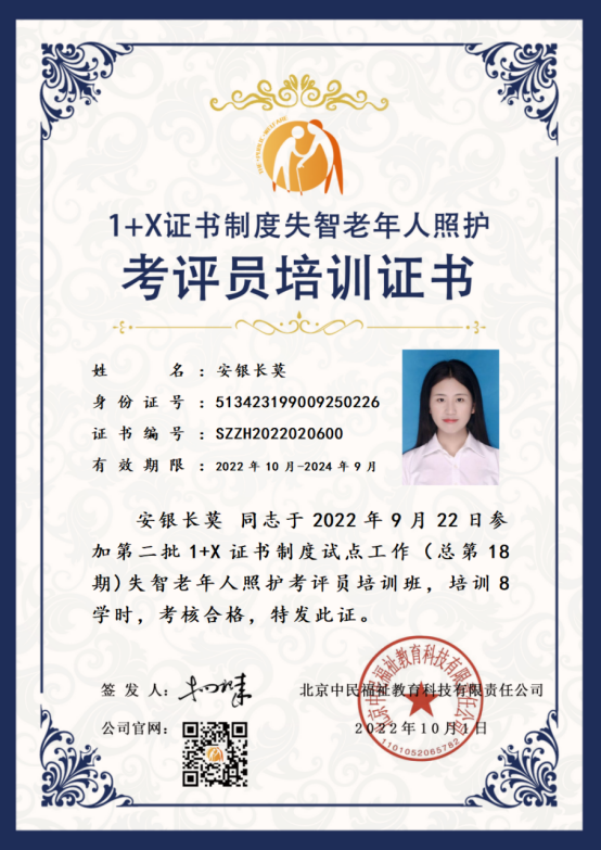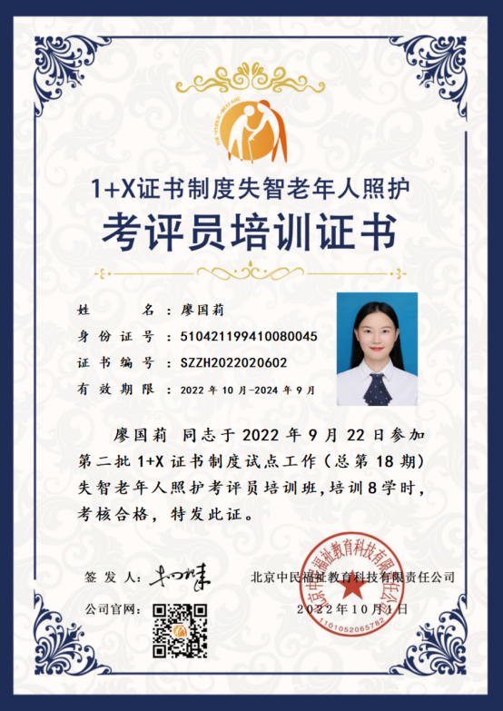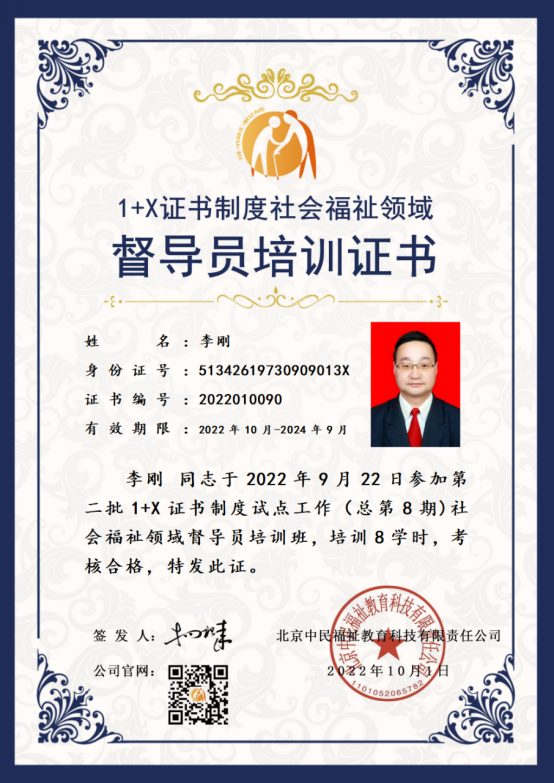 为贯彻实施《国家职业教育改革实施方案》《教育部办公厅国家发展改革委办公厅财政部办公厅关于推进1+X证书制度试点工作的指导意见》, 西昌民族幼专职业教育系8名教师于2022年9月参加1+X证书制度社会福祉领域督导员以及考评员培训,并于10月1日全部获得培训合格证书。