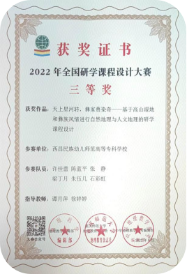 备赛期间,许佳蕾小组在指导老师带领下,到凉山州昭觉县谷克德进行实地考察,发现谷克德是夜观星空的极佳地,抬头便可看见满天星河;以及独特、浓厚的民族文化,孕育出了多彩的彝族蒉染、漆器等非遗文化。许佳蕾小组通过实地考察调研收集资料,最终确定研学方向,历经两个多月的团结协作,设计出了“天上星河转,彝家蒉染奇—— 基于高山湿地和彝族风情进行自然地理与人文地理的研学课程设计”,并荣获三等奖。