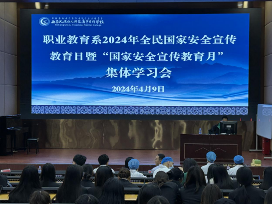 为进一步深刻领悟习近平总书记关于党的自我革命的重要思想,坚定不移推动教育系统全面从严治党向纵深发展以及宣传全民国家安全教育,4月9日中午12:30职业教育系在第三教学楼3215会议室传达学习全省教育系统全面从严治党视频会议精神,下午15:00在学术报告厅B厅组织师生集体学习2024年全民国家安全宣传教育日暨“国家安全宣传教育月”活动,会议由系党总支部副书记、系副主任李刚主持,全体教职工及部分学生代表共260余人参加学习会。