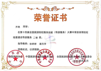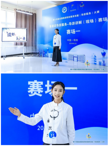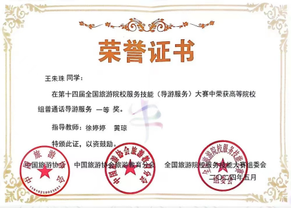 比赛设普通话导游服务和英语导游服务两个项目,每个赛项分别包括理论考核、导游讲解和才艺展示。大赛共聘请46位权威专家担任裁判,并采用最新的评分系统,即时公布选手成绩,确保比赛的公平、公正、公开。我校旅游管理专业大一学生王朱珠、齐艳,经过三天的激烈角逐,最终分别喜获一等奖和二等奖!