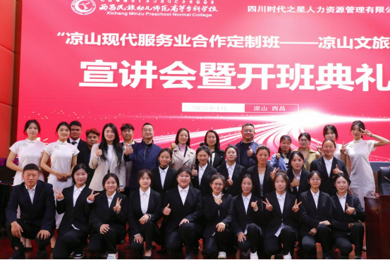 为深化产教融合,服务地方现代服务业发展,西昌民族幼专与凉山文旅集团四川时代之星人力资源管理有限公司联合打造的“凉山现代服务业合作定制班——凉山文旅班”于4月2日正式开班,学校党委委员、副校长王晓东,职业教育系党总支书记、系主任曾艳,凉山文旅集团四川时代之星人力资源管理有限公司董事长马静、劳动关系部负责人王建琼,以及职业教育系相关负责人、企业嘉宾、旅游管理专业师生参加了开班仪式。