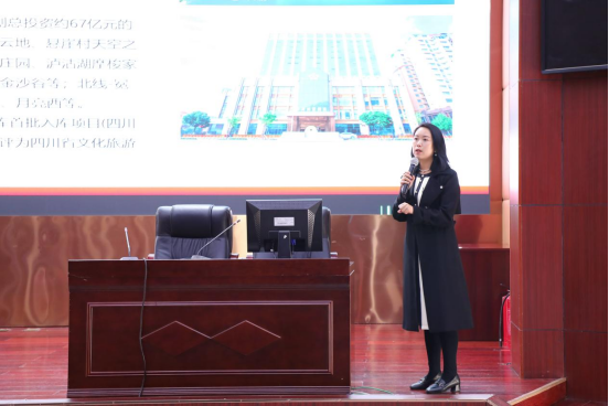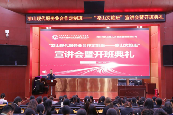王晓东副校长代表学校与四川时代之星人力资源管理有限公司签署了校企合作协议,并为马静董事长颁发了产业导师聘书。曾艳主任公布首届定制班名单并宣布凉山文旅班正式开班。马静董事长从企业发展历程、核心业务、品牌战略、文化建设等维度,对凉山文旅集团作了全面介绍,重点解读了"凉山文旅班"的特色培养模式和职业发展前景。她结合自身工作经历,为在场学子带来了精彩的职业生涯规划指导,其富有感染力的分享赢得现场阵阵掌声。