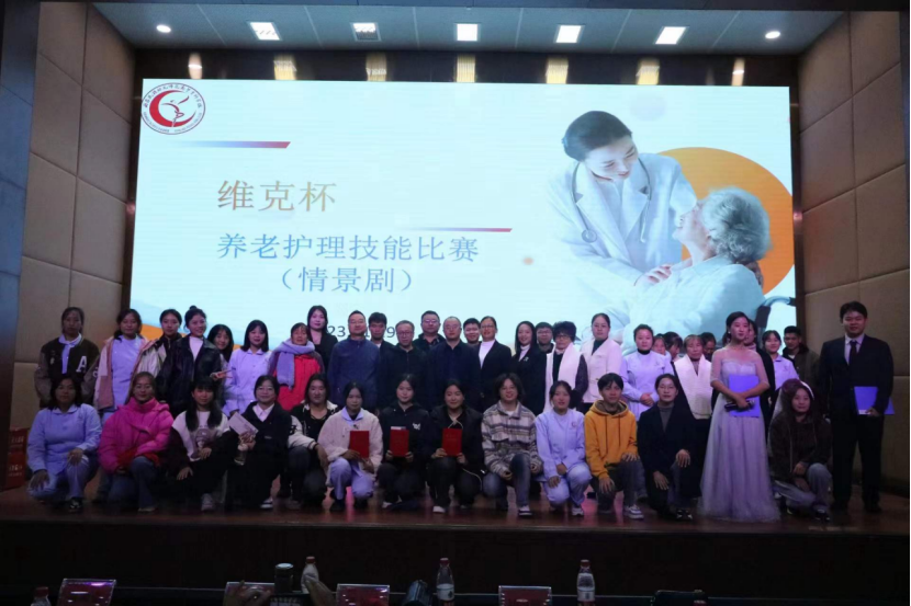 为激发养老护理员学技术、练本领、比技能的热情,增强对养老护理职业的认同感、荣誉感,推进养老护理的标准化、专业化发展,激励养老专业学生的不断学习和进步,提升对老年人的关爱和护理能力,职教系以校园文化艺术节为契机,结合专业教研成果,于2023年11月19日上午9:00在学术报告B厅举行“维克杯”养老护理技能比赛(情景剧),此次比赛有6支队伍参加角逐。出席本次比赛的领导和嘉宾有学校党委委员、副校长王晓东,江门职院经管学院副院长胡志权,西昌邛海国际康养社区副院长熊文兰,护理科主管赵飞雁,职业教育系党总支书记、系主任曾艳,职业教育系党总支副书记、系副主任李刚,职业教育系党总支委员、系副主任秦毓志。