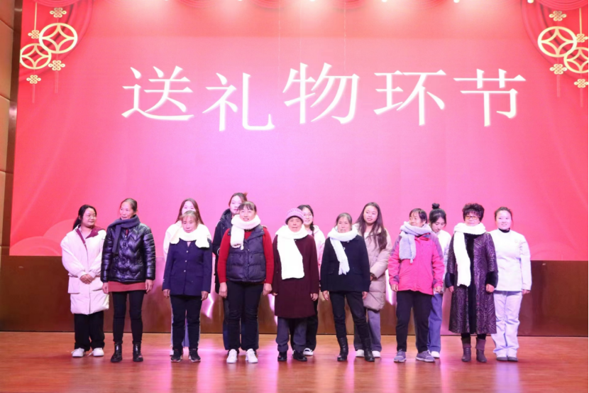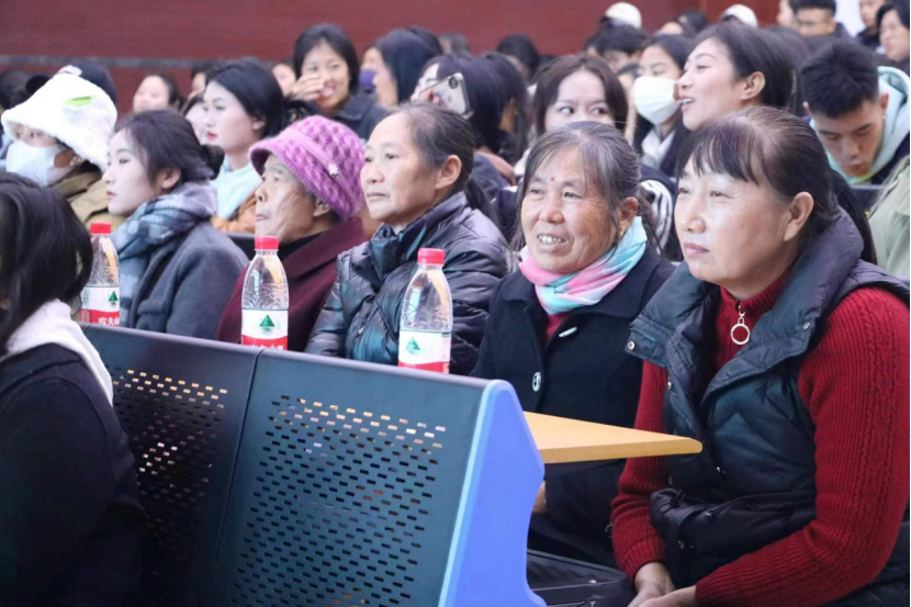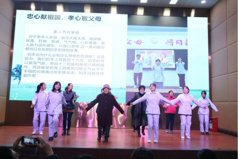虽慵兴犹在,虽老心犹健。莫道桑榆晚,为霞尚满天。六组选手表演结束后,22级养老专业的6名同学邀请到了7位老年人,共同为大家带来一段健康养生操。表演结束后,孩子们还为阿姨们送上了一份特别的礼物---一条亲手织的围巾,以小爱之举,暖夕阳之寂,让温暖化为力量,让感动不断蔓延。