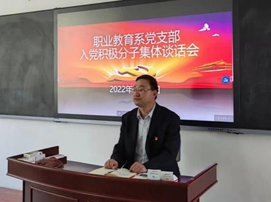 职业教育系党支部书记李刚对入党积极分子提出希望和要求,强调:人无德不立,育人的根本在于立德。一是要端正入党动机,深化对党的认识,坚定正确政治方向。二是要铸牢政治理想信念,坚持把思想政治工作贯穿育人始终。三是要自觉加强党章、党纪党规的理论学习,进行社会主义核心价值观教育。四是要做遵规守纪的标兵,在班级起到模范带头作用,树立正气,敢于同不良现象作斗争。