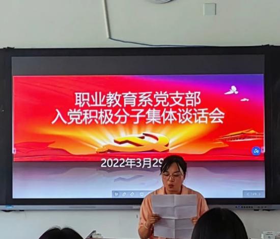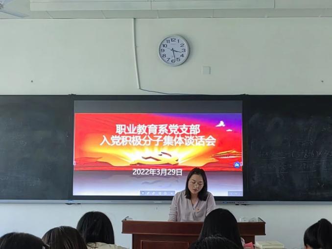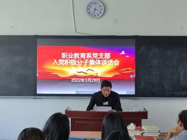 为全面准确地了解入党积极分子的思想状况,对入党积极分子面对面地进一步帮助教育。职业教育系党支部于2022年3月29日下午三点在第七教学楼7102教室组织开展了入党积极分子集体谈话会。