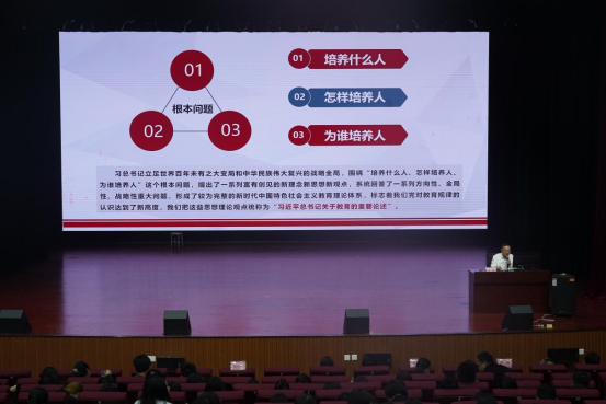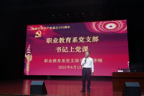 为庆祝中国共产党成立102周年,认真传达学习党的二十大精神和习近平总书记在主持二十届中共中央政治局第五次集体学习发表重要讲话精神,2023年6月13日下午,职业教育系党支部书记李刚在雏鹰剧院为职教系全体党员、入党积极分子和全体教职员工上了一堂专题党课。