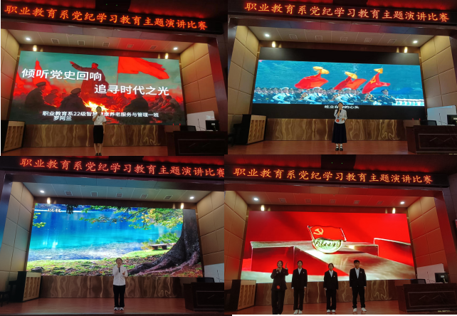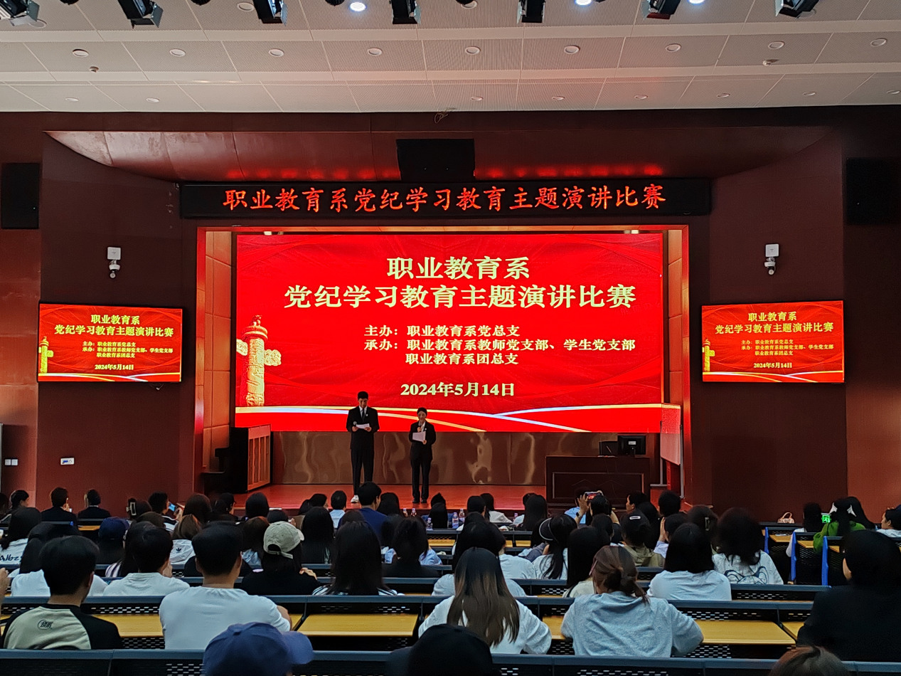 2024年5月14日,由职业教育系党总支主办,职业教育系教师党支部、学生党支部、系团总支联合承办的党纪学习教育主题演讲比赛决赛在学术报告B厅举行。职业教育系党总支书记、系主任曾艳,职业教育系党总支纪检委员、信息中心主任邹玉泉,职业教育系党总支副书记、系副主任李刚,职业教育系党总支宣传委员、系副主任秦毓志等领导莅临现场,职业教育系全体教职工及学生代表260余人参加。