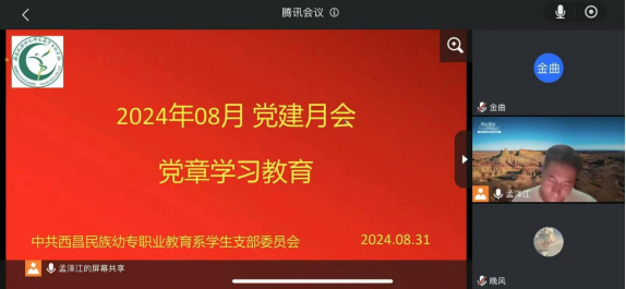 职业教育系学生党支部党建月会于8月31日在线上顺利召开,本次会议主题为党章学习教育。会议由职业教育系学生党支部书记孟泽江主持,支部全体党员和入党积极分子参加会议。