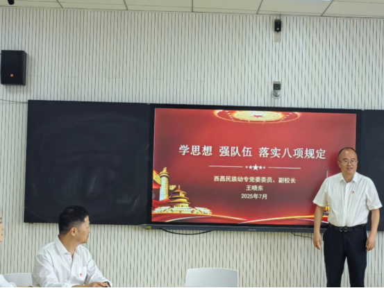 2025年7月4日,西昌民族幼专党委委员、副校长王晓东同志在一教1705会议室,以“学思想、强队伍、落实八项规定”为主题,面向师生党员讲授学习教育专题党课。职教系教师党支部和学生党支部师生党员45人认真聆听了本次党课。
