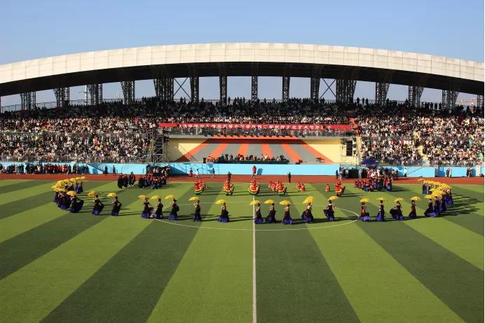 亮黄色的衣服与明媚的阳光交叠,形成强烈的视觉冲击,给人心神一晃;观众席皆是欢呼赞叹声延绵不绝,汇聚成一支动人的交响乐;鼓声震耳欲聋响彻校园各处,青春与年少碰撞出火花,以排山倒海的气势汹涌而来。