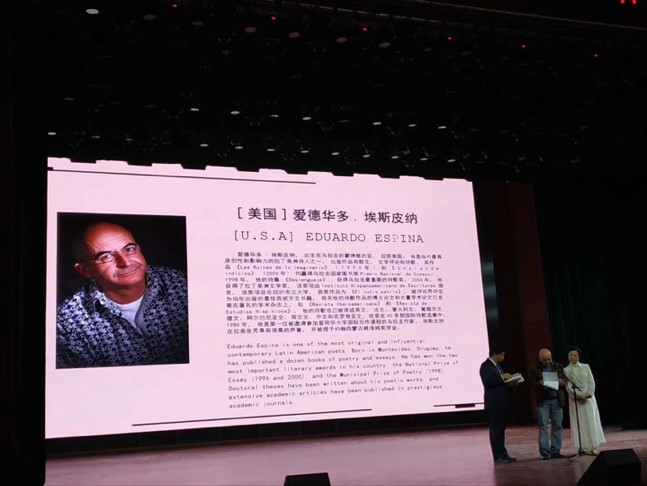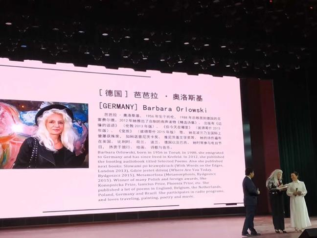 学生舞蹈《水墨丹青》拉开了诗歌朗诵会的序幕。徳国诗人芭芭拉.奥尔夫斯基,《大诗歌》主编、诗人周庆荣,意大利诗人伊戈.科斯塔佐,安徽诗人代雨东,贵州诗人南欧,《星星》诗刊主编、诗人干海兵,云南大学教授、诗人李骞等陆续上台,深情朗诵。大凉山走出的著名诗人、中国作家协会副主席、书记处书记、西昌邛海·“丝绸之路”国际诗歌周组委会主任吉狄马加进行了压轴的诗歌朗诵,诗人们生动的朗诵引来学生的阵阵掌声。诗歌的无边界,此时就像音乐作为一种"世界语言"一般,在瞬间传达了一种"不能言说的言说",去完成族际沟通和不同文化间的理解。