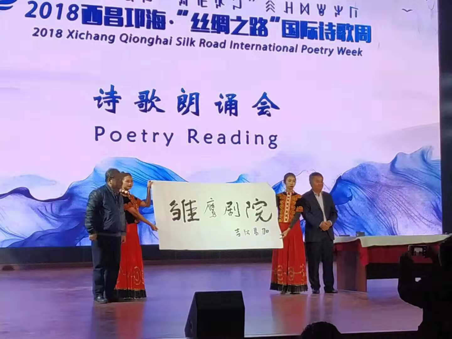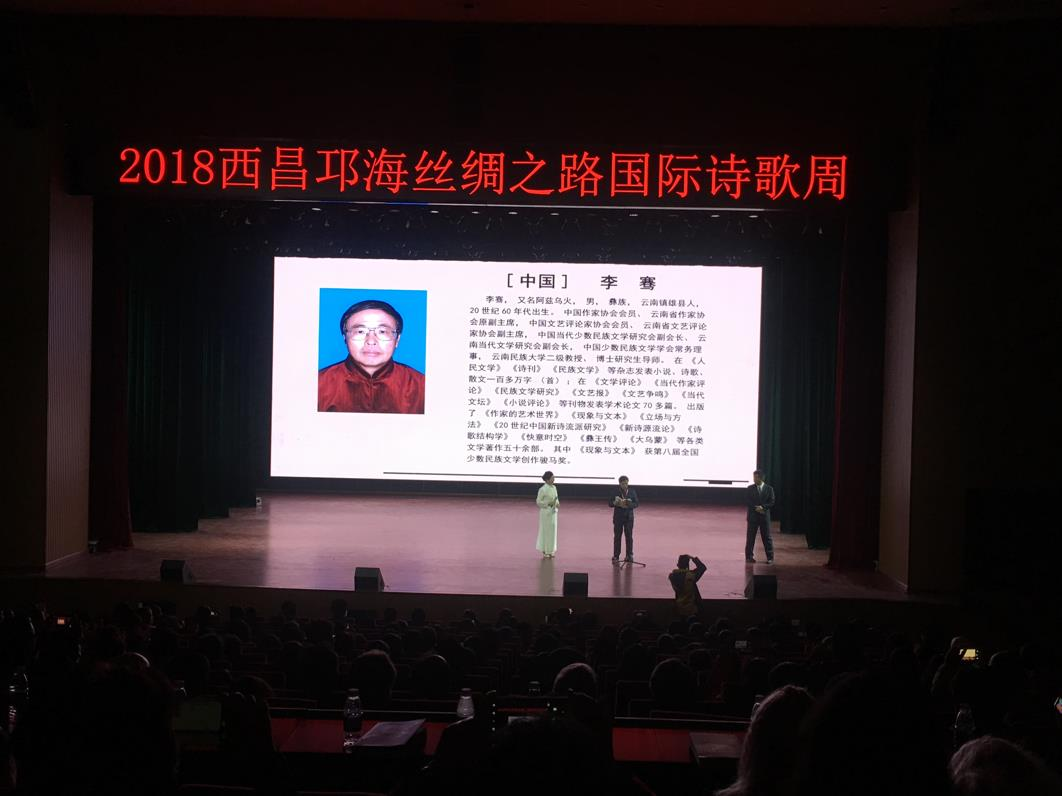 11月18日晩8点,2018年西昌邛海.“丝绸之路”国际诗歌周的第一场诗歌朗诵会在西昌民族幼儿师范高等专科学校演艺中心举行,来自美国、英国、德国、阿根廷、波兰等11个国家的国际诗人,与来自四川、北京、山东、青海、云南等地的几十个中国诗人云集在此,为学校师生上了一堂生动的关于诗歌与文学的赏析大课。