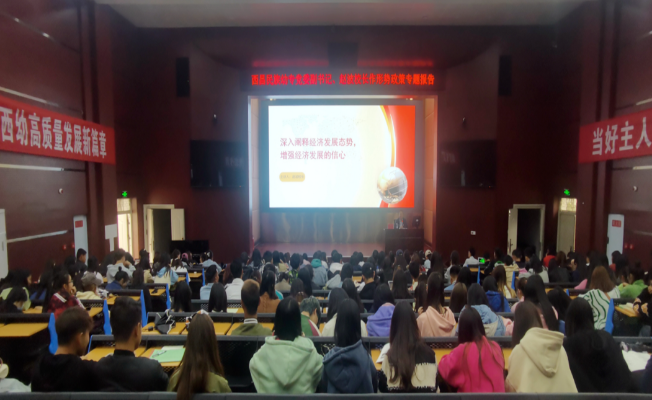 近日,党委副书记、校长赵波以《深入阐释经济发展态势,增强经济发展的信心》为题,为我校职业教育系和艺术教育系的两百余名学生作了“形势与政策”专题报告。