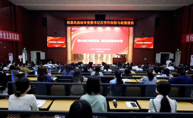 近日,学校党委书记石芳以《凝心聚力谋发展 感恩奋进向未来》为题,在学术报告A厅为小学教育系和学前教育系百余名学生作了一堂生动的“形势与政策”专题报告。