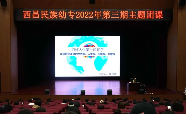 5月17日,西昌民族幼专心理学教师廖书廷以《扣好人生第一例扣子--如何树立正确的世界观、人生观、价值观、恋爱观》为题,在雏鹰剧院为400名师生代表进行了第三期主题团课宣讲。