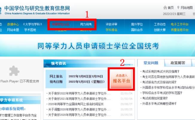 网报截止时间:2022年3月20日,网上报名请登录“中国学位与研究生教育信息网”,进入全国同等学力人员申请硕士学位管理工作信息平台进行注册。